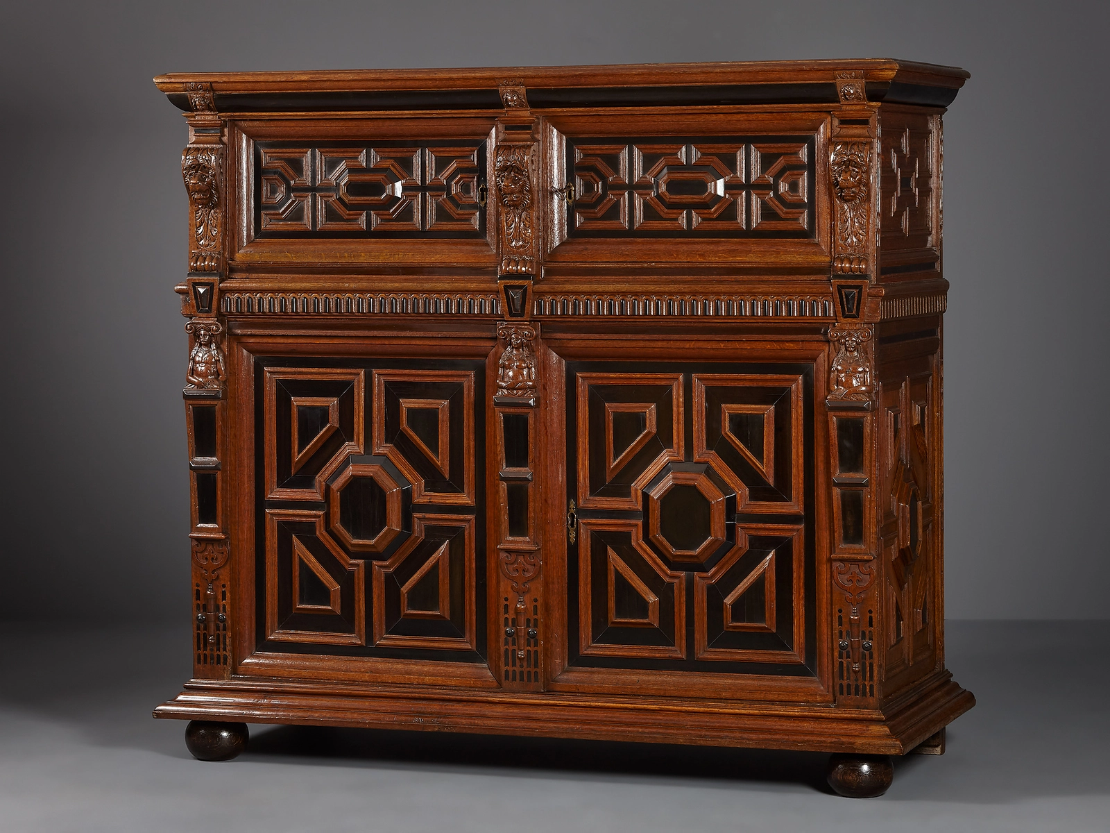 A four-door oak cupboard with geometrically divided fields on the panelled doors consisting of oak and ebony. At the front, the cupboard stands upon blackened wooden ball feet. The cupboard is visually divided into two sections, separated at the sides by figurative pilasters with sculpted decorations that run from bottom to top. The wide doors in the upper section are separated by ornaments in the shape of lion’s heads and stylised acanthus leaves with lion’s feet at the bottom. Above, in the convex ebony cornice overhanging the entire width of the cupboard, the three pilasters are surmounted by decorative cherub’s heads.