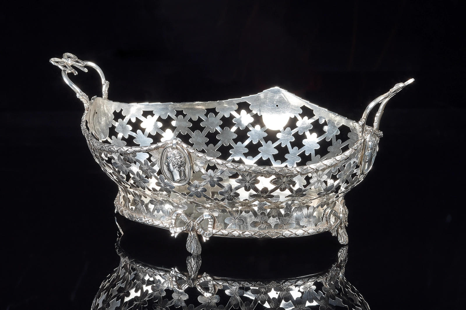 An elegant bread basket with a typical Louis XVI design. The boat-shaped basket is entirely constructed from an openwork grid of flowers that are connected to each other. The upper and lower edges are in the shape of corn leaves and cobs. On the sides of the basket are two large handles in the shape of bows, with a seemingly hanging medallion with a portrait of a Roman emperor underneath. The basket is supported by four legs in the shape of casual bows with bobbins.