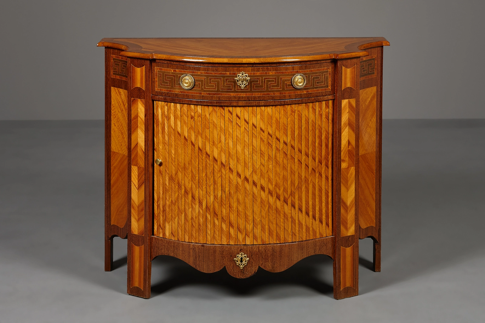 This cabinet is decorated with neoclassical motifs and fittings in a pure neoclassical Louis XVI style, whereas its shape more strongly reflects the visual idiom of the Transition period.