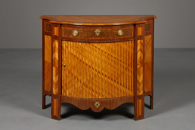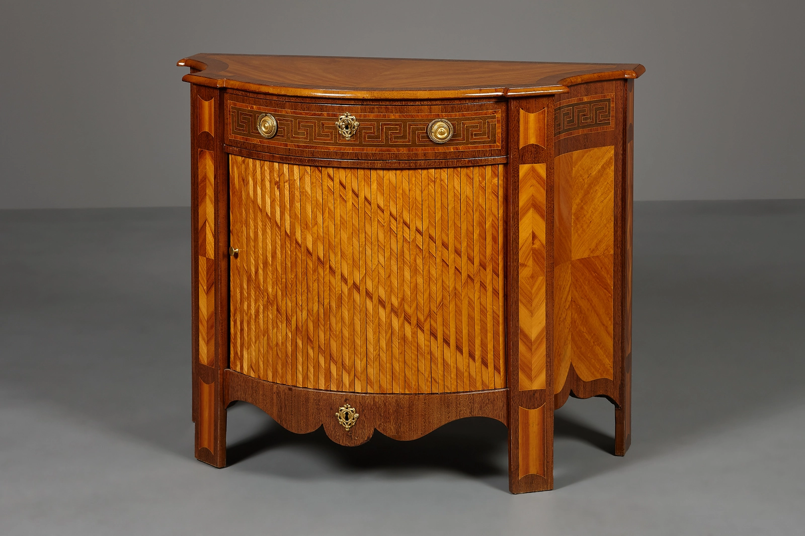 The cabinet has a single drawer above a tambour door. The concave sides lend the whole an unexpectedly elegant shape that is further emphasised by the fields of rosewood with thin boxwood piping. The diagonally oriented stiles are decorated with a mirrored chevron pattern. The top features butterfly-shaped tulipwood veneer framed in purpleheart. The profiled edge is solid mahogany.