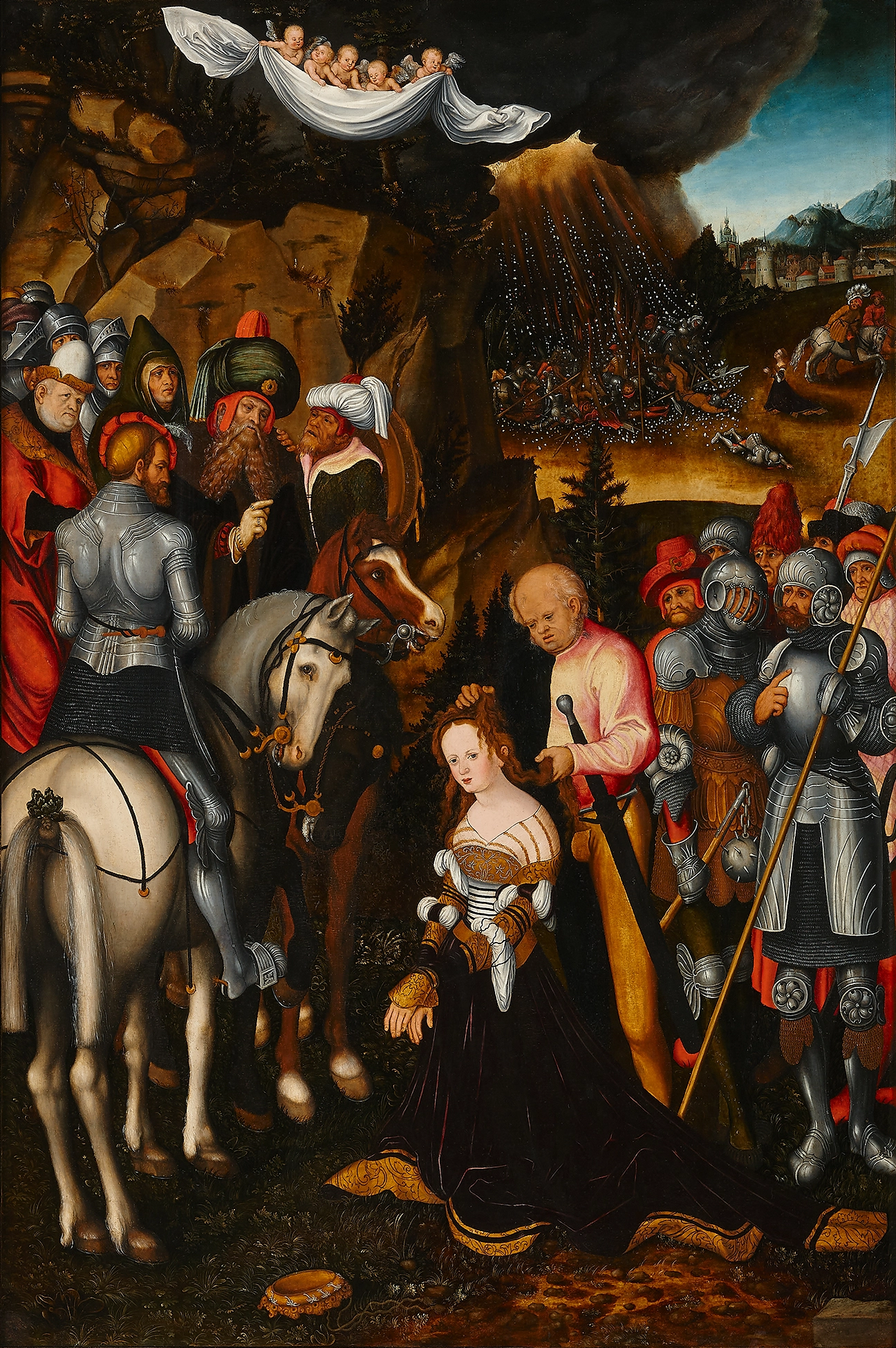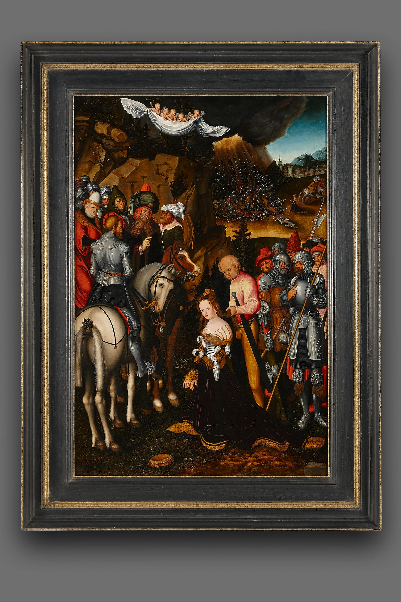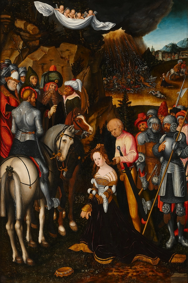 This piece is an exceptionally fine copy of the painting of the beheading of Saint Catherine that Cranach produced in 1515 for a church in Olomouc (German: Olmütz) at the commission of Stanislaus Thurzo. The latter is now housed in the archiepiscopal palace in Kroměříž along with a pendant depicting the beheading of John the Baptist. Cranach considered the 1515 commission prestigious enough to insert himself into the John the Baptist painting as one of the soldiers.
