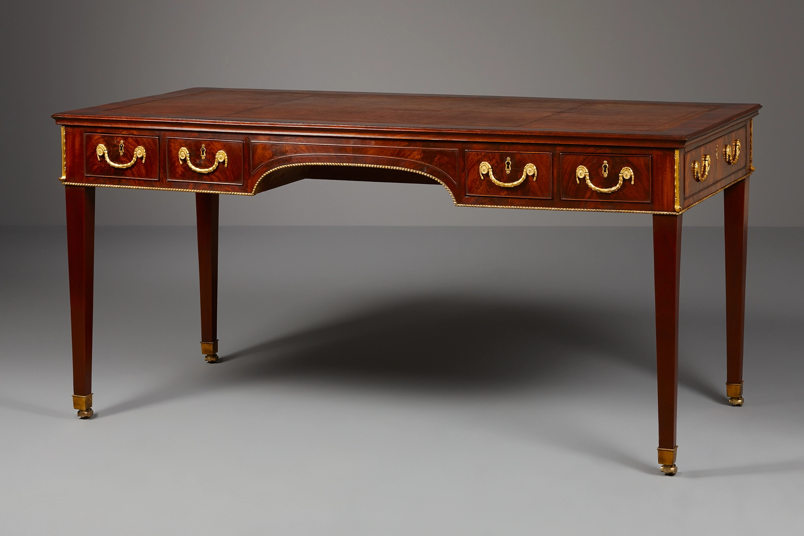 An elegant English Georgian writing table in neoclassical style with 9 lockable drawers. This writing table, that is designed to stand freely in an office, has square tapered legs that end in brass casters. The leather-clad top has a wide mahogany rim. The outer rim of the leather top is decorated with a stylized gilt vine.