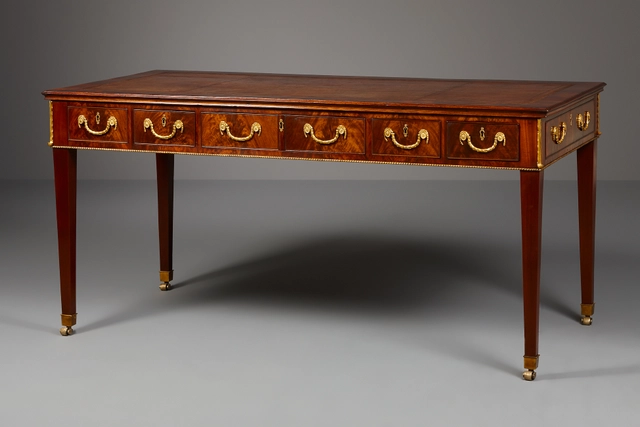 Although a large part of English furniture from the Georgian period (1714-1801) is characterized as “to the French taste”, this late Georgian writing table shows a much more sober style with straightforward shapes and straight lines. This development, initiated by Robert Adam, returns to the simplicity and elegance of the Classical. This neoclassical style with its geometric shapes and ornaments in Roman and Greek style can easily be recognized in this elegant writing table.