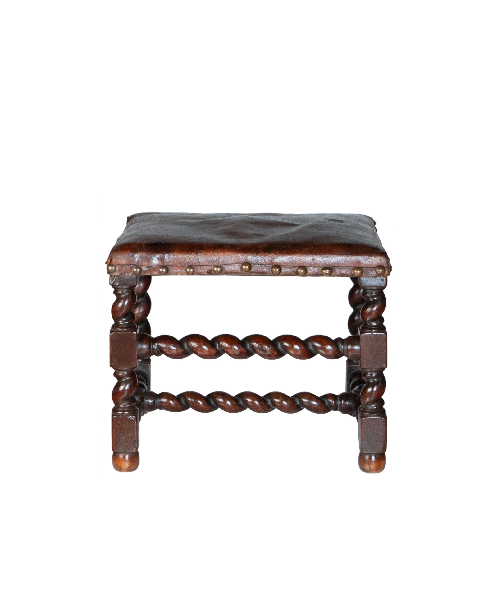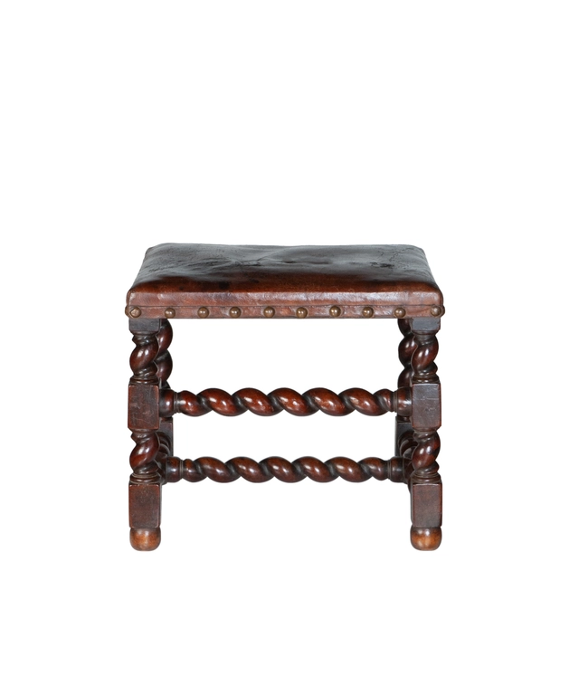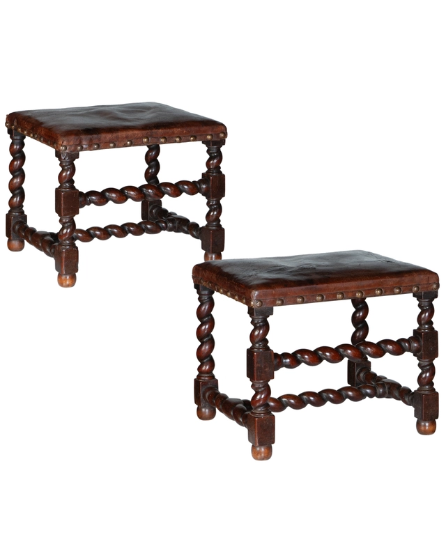 Fine Pair 17th Century Twist Baroque Walnut Stools with Leather Upholstering