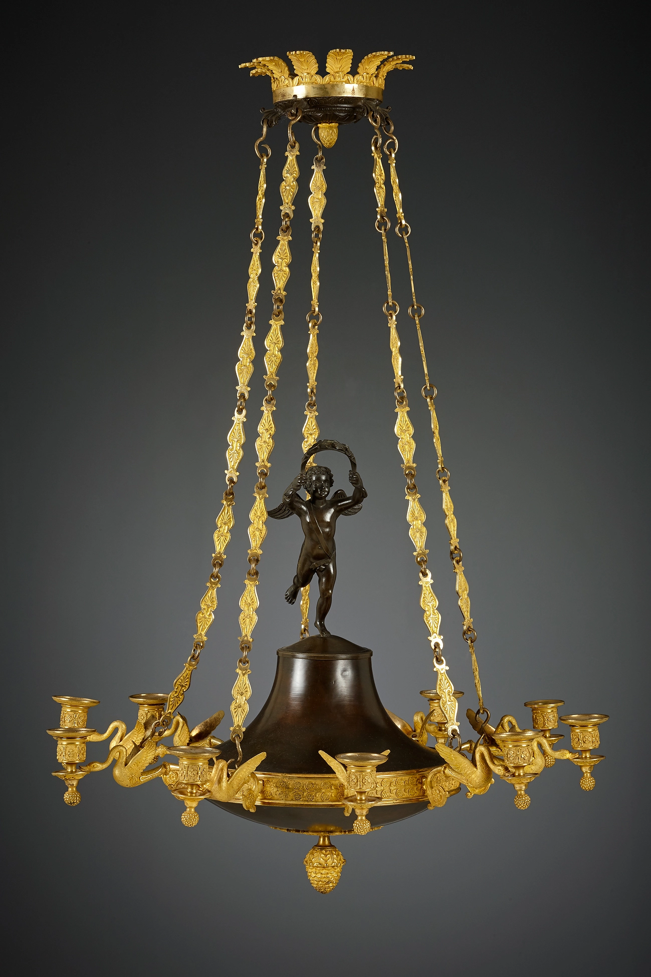 A small, ornate ten-light discus chandelier, the corona connected to the concave well by five gilt-bronze chain links. The corona surmounted by applied palmette motifs, a gilt-bronze finial in the form of a pinecone at its base. The central disc is topped by a cast figure of Amor holding a laurel wreath. The disc has a richly decorated gilt bronze rim issuing gilt bronze branches modelled as swans with outspread wings. The graceful aquatic birds give the illusion of carrying the candleholders upon their beaks.