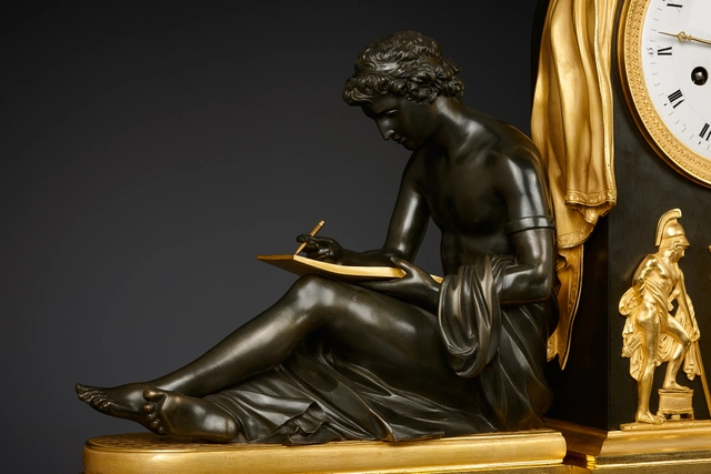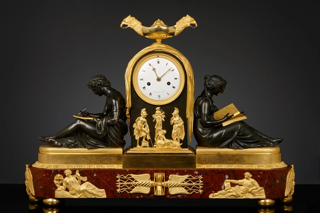 The sizable mantel clock and rouge griotte marble base stand on six ball feet. On the centre of the base a patinated clock case, the draped top is headed by an oil lamp flanked by eagle-heads. The case itself is sided by the two patinated figures of Study and Philosophy in the form of a writing man and a reading woman. This model is an interpretation of the common classical model from the 18th century: ‘L'Étude et le Philosophie, after a design by Louis Simon Boizot (1743-1809).