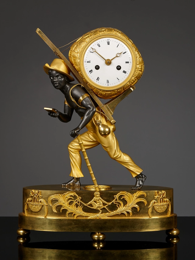 This mantel clock is a testament to people’s fascination with the exotic in general. Where the Far East (China, Japan, India) had been the prime target of this fascination in the early eighteenth century, its focus shifted to Africa and America in the late eighteenth and early nineteenth centuries. It was further fuelled by the publication of various novels (Paul et Virginie by Bernardin de Saint-Pierre in 1787 and Atala by Chateaubriand in 1801) and, in particular, Jean Jacques Rousseau’s Discourse on the Origin and Basis of Inequality Among Men, which had been published in 1755. The authors of these works painted an idealised portrait of “le bon sauvage”, the noble savage - primitive people who had not yet been corrupted by “civilisation”, and instead were good in essence and by nature. Literature was not the only influence, though; the decree abolishing slavery that had been passed in 1793 in France had an effect as well.