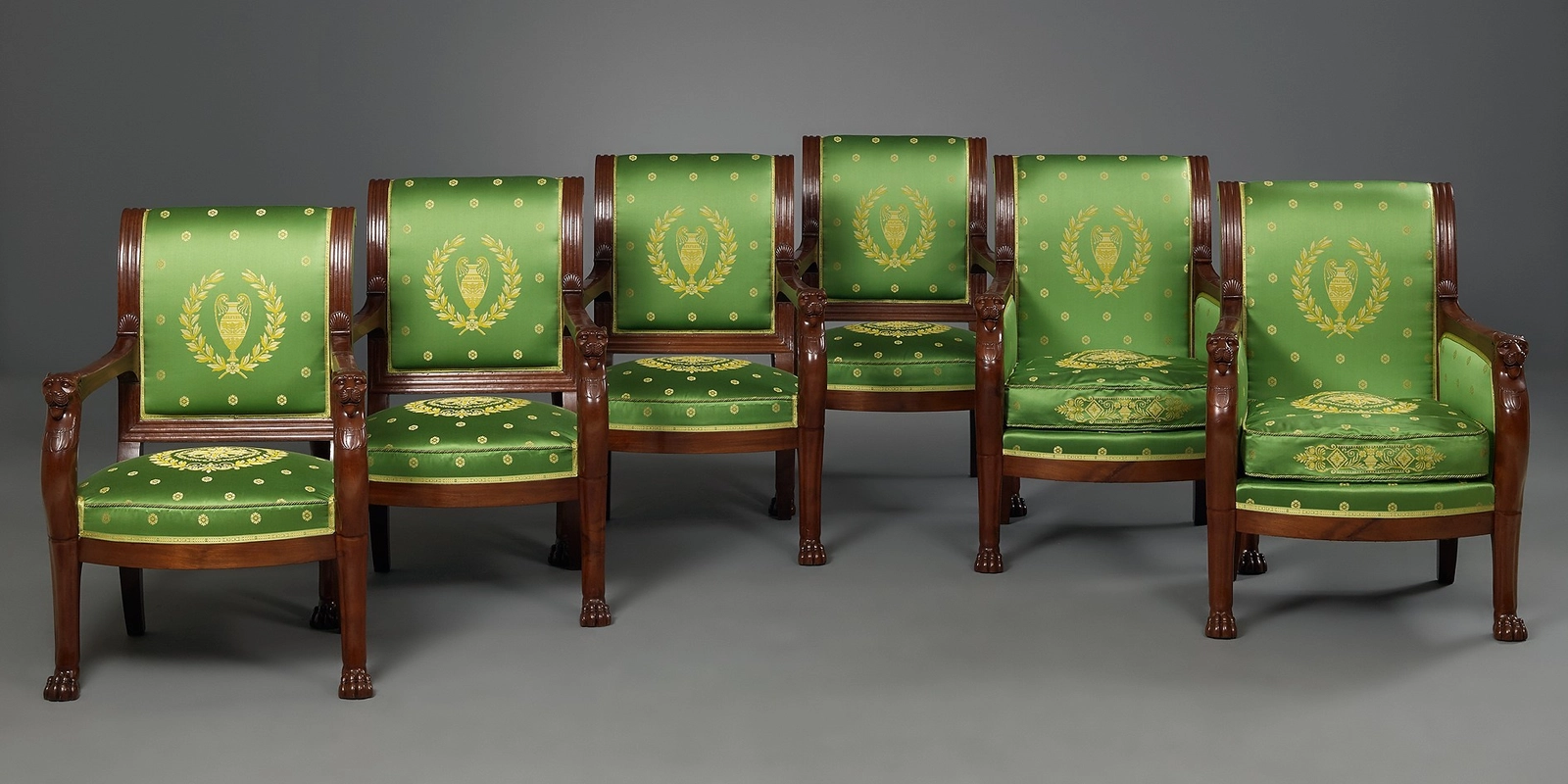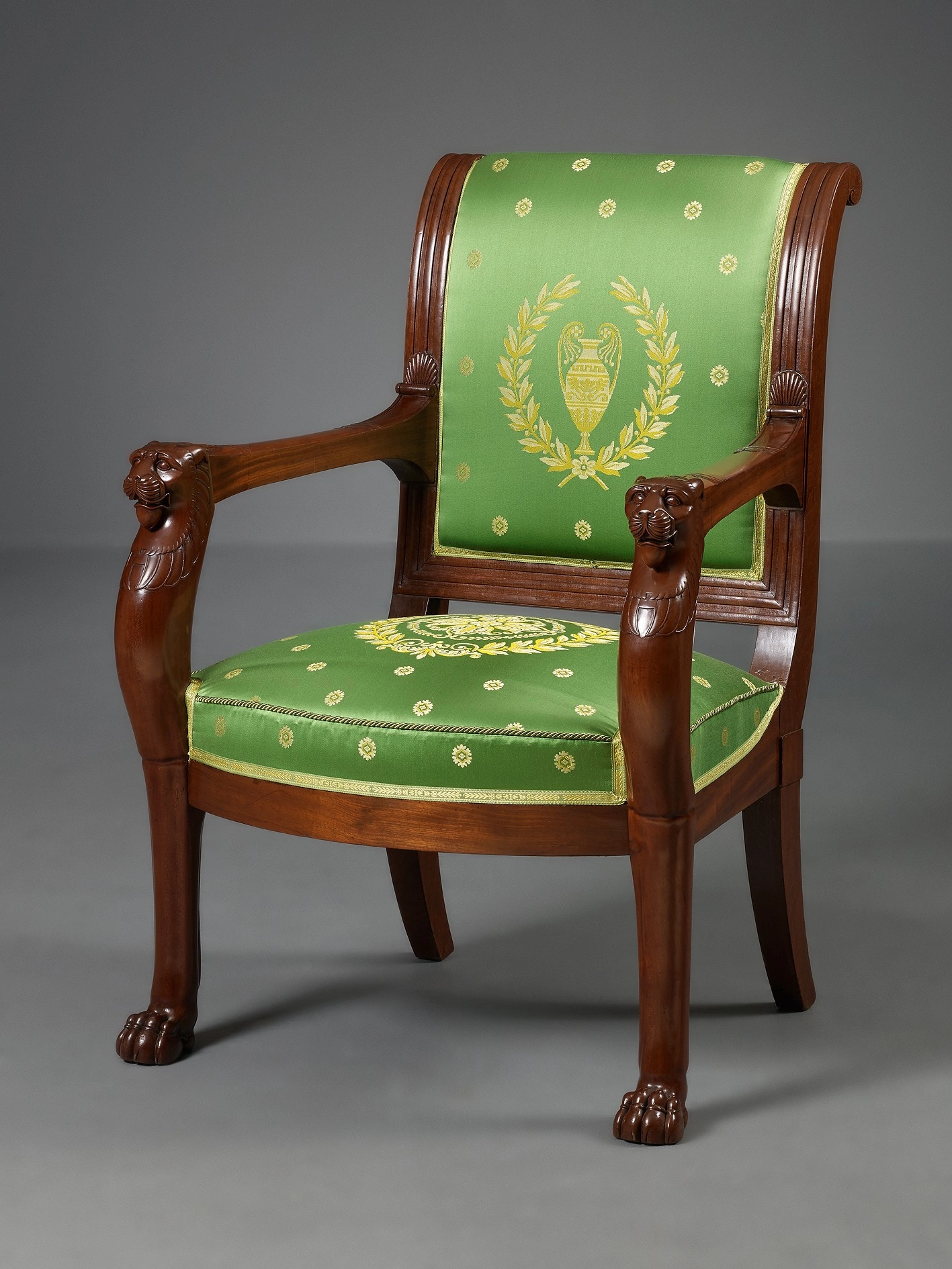 Over a period of 80 years the Jacob dynasty produced chairs and furniture of an outstanding quality. In 1765 Georges Jacob (1739-1814) founded his company in Paris, after he had been appointed maître menuisier. Two of his sons, Georges II and François-Honoré-Georges, took over the company when he retired in 1796. When Georges II dies in 1803, their father returns from retirement to develop the business on the rue Meslee to what would become one of the largest furniture workshops in the Napoleonic era in Paris. Later, in 1825, Georges Jacob’s grandson Georges-Alphonse Jacob-Desmalter continued the company until the reign of Louis-Philippe. In 1847 George-Alphonse ended the company and dedicated himself to architecture.