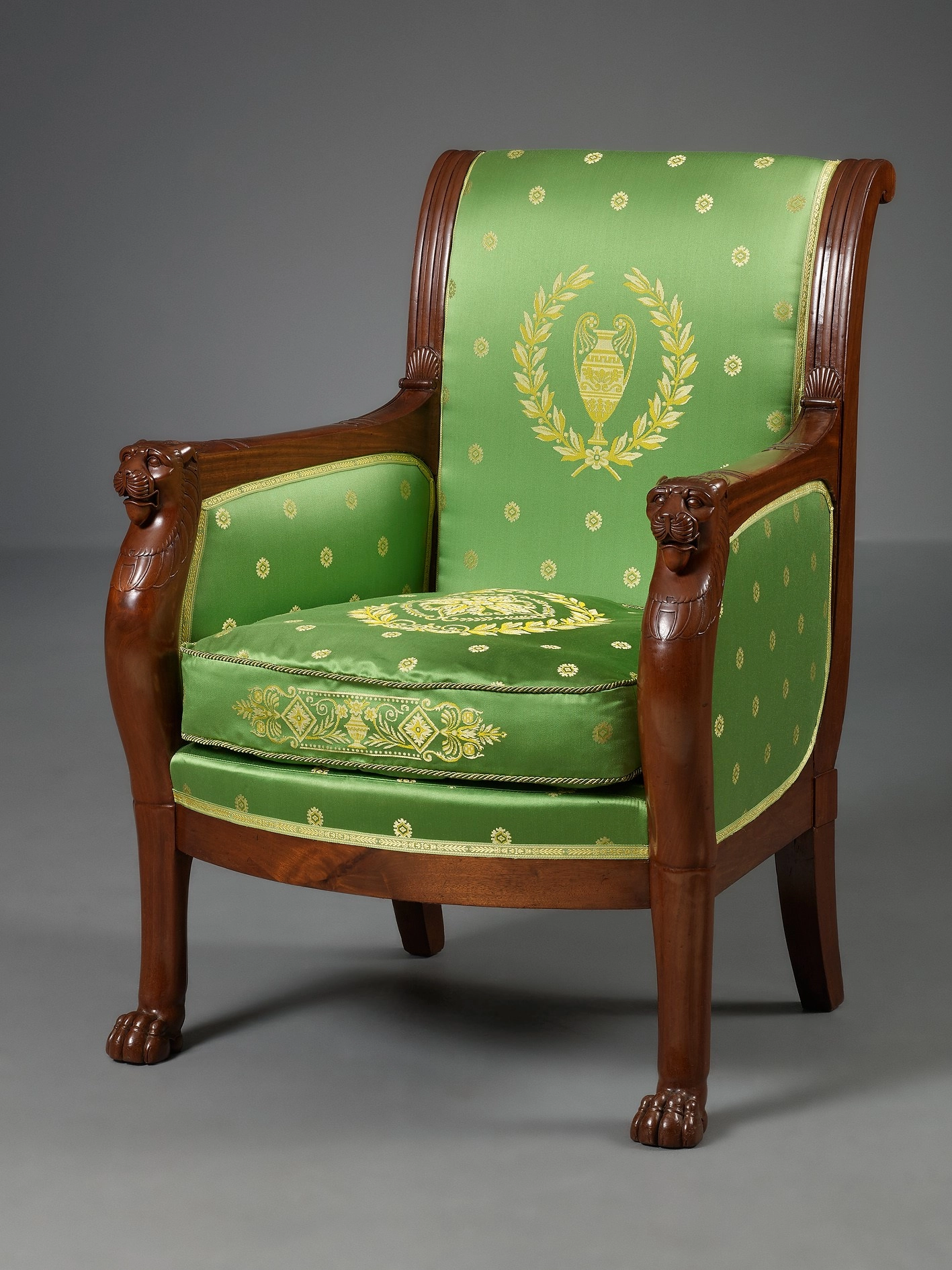 When Napoleon comes to power, he evidently influences the style of interior design and decorative arts. Around 1803 the Empire style develops, demonstrating a taste for massive and imposing elements. Inspiration is derived from military campaigns – notably to Egypt – and martial attributes that are used as decorative elements. The British Blockade, that started in 1806, forced furniture makers to substitute exotic wood species with native material like walnut, maple, lime, and ash. A much preferred material, however, is mahogany.