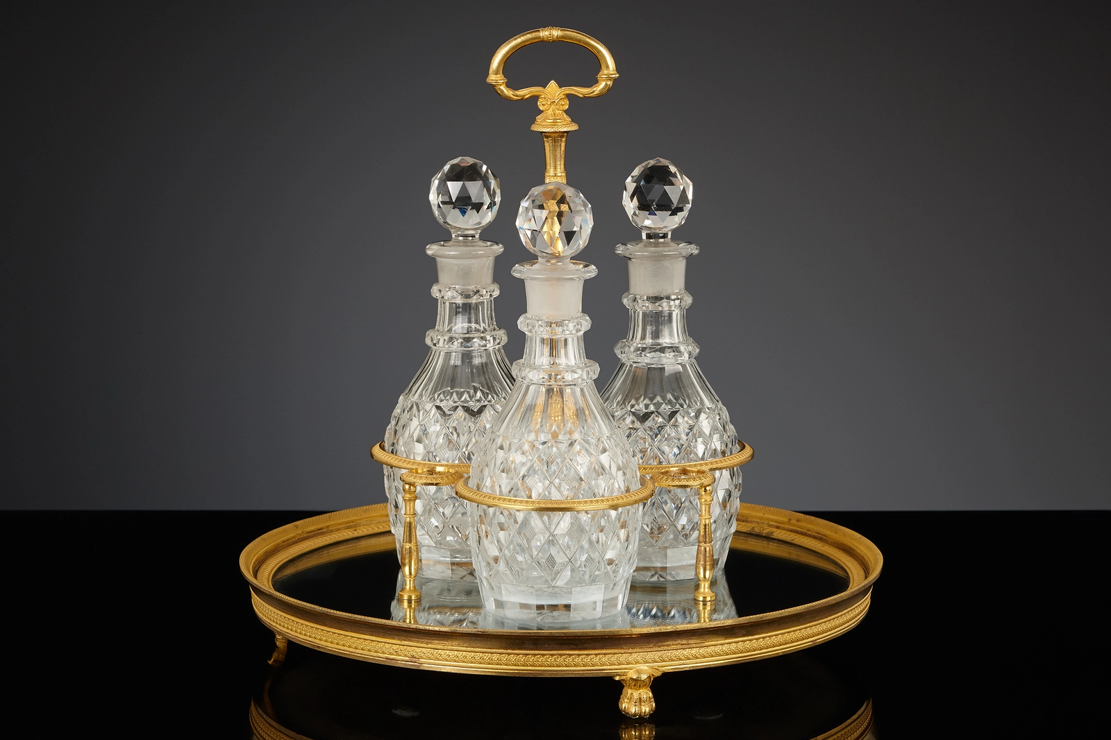 A low surtout-de-table on three small clawed feet with three elegant cut crystal decanters perched in an ormolu rack. The surtout has a mirror glass bottom with an ormolu mount with a low gallery. The rim is decorated on the outside with a stylized leaf vine boarded by cable motifs.