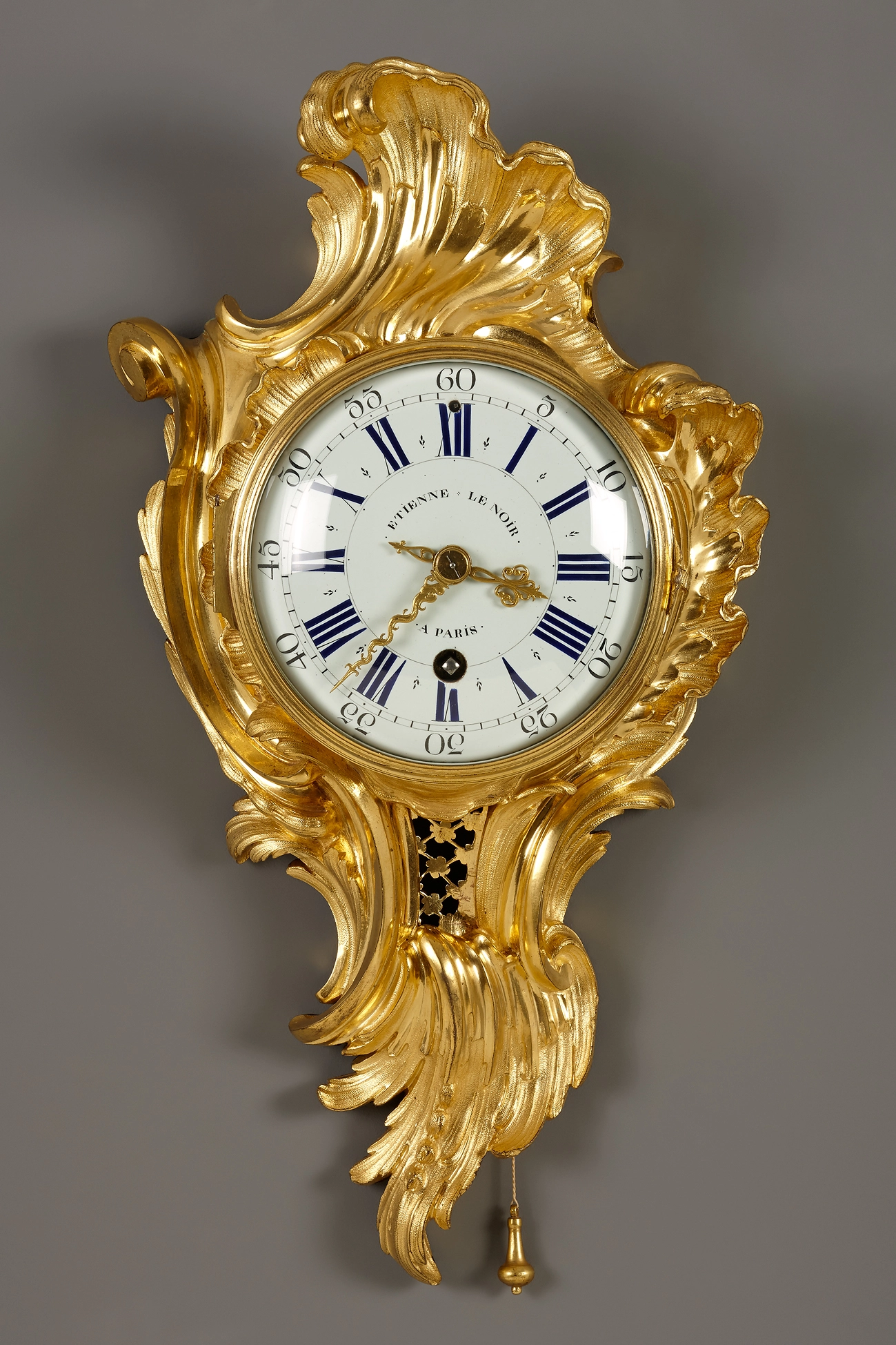 The fourteen-day movement is driven by a spring barrel. It is regulated by an anchor escapement in combination with a pendulum hung on silk. The movement has a pull quarter repeat on two bells. The white enamelled dial features blue Roman numerals for the hours and an outer ring indicating the minutes in black Arabic numerals. The openwork hour and minute hands are made of gilt bronze. The clock is signed in the centre: “Etienne Le Noir à Paris”. The reverse of the dial is signed “A.N. Martiniere, P. naire du Roy, may 1748”.