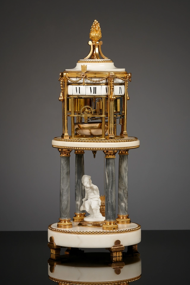 The clock is signed on the minute ring: Barancourt à Paris. This model of clock is known as Temple de l’amour (Temple of Love) in reference to the eponymous colonnaded dome near the Petit Trianon in the garden of Versailles Palace, which was built in 1777-1778 based on a design by architect Richard Mique (1728-1794).