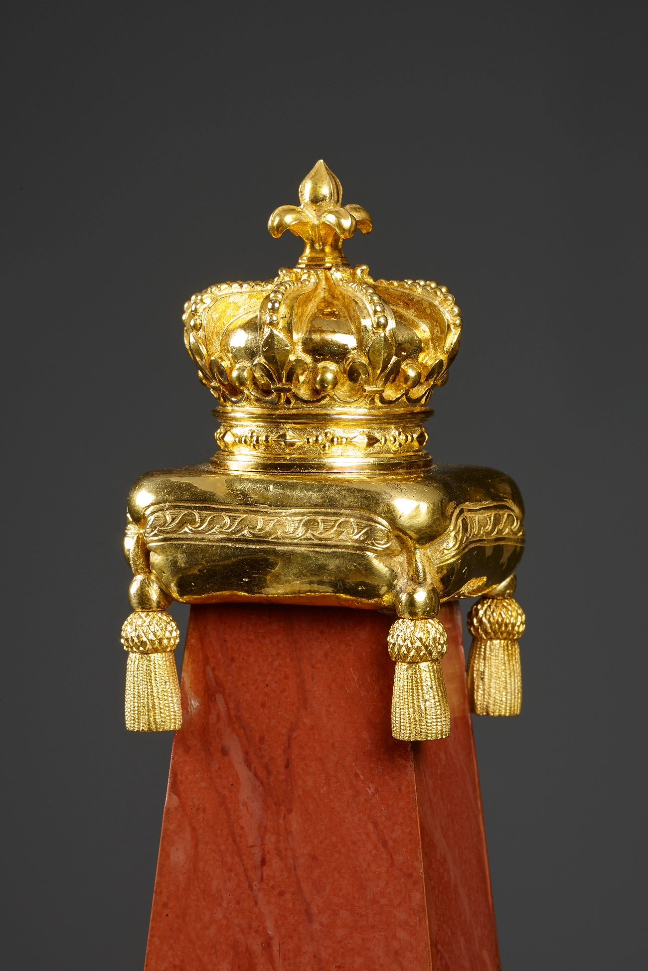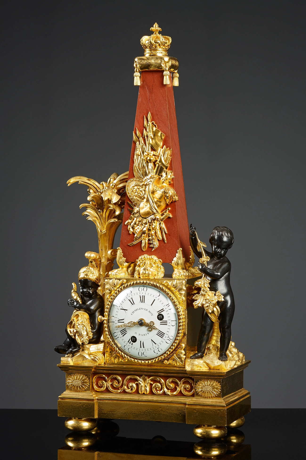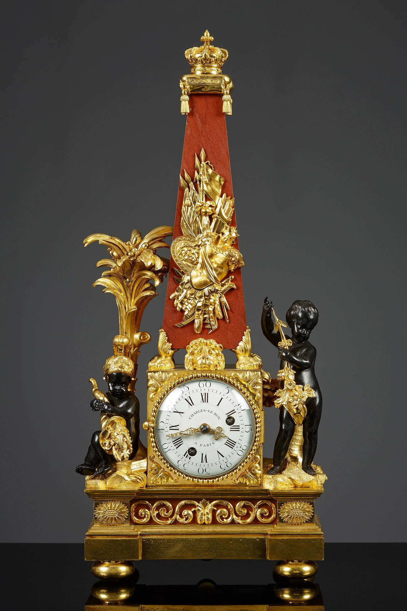 This lavish Louis XVI mantel clock features a red marbled obelisk raised on paw feet. The obelisk is embellished with a gilt bronze appliqué with military motifs and topped by a royal crown with fleur-de-lis on a cushion. Two patinated figurines of putti on rockery flank the dial. On the left, a putto wearing a plumed helmet with a lionhead sits before a palm tree, a cornucopia filled with crowns and other princely decorations in his hands. The other putto leans against a tree trunk with a laurel wreath over his left arm.