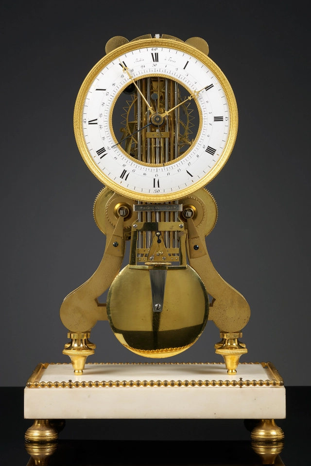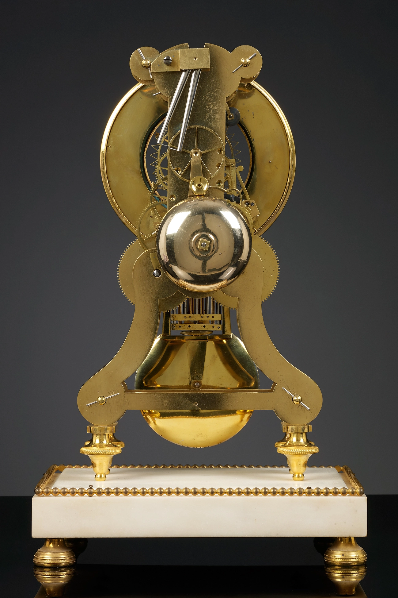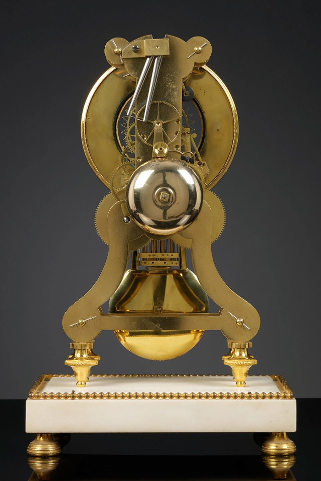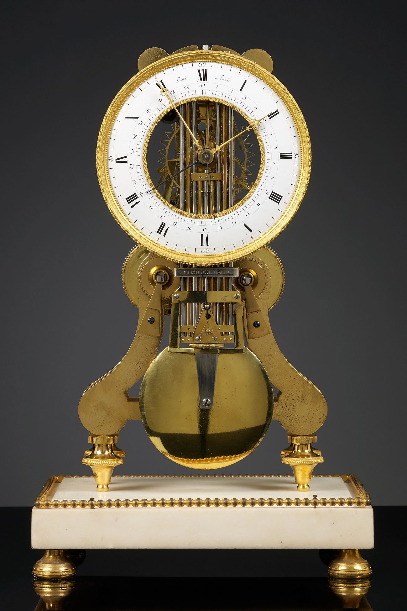 The mantel clock has a white marble base on four gilt bronze feet. The top of the marble base is framed with a gilt bronze beaded edge. The brass frame stands on four adjustable toll-shape feet. The open enameled dial is framed on the outside and on the inside with a gilt bronze profiled edge decorated with leaf motifs. The hour and minute hands are made of gilt bronze, the hands for the seconds and date are made of blued steel.