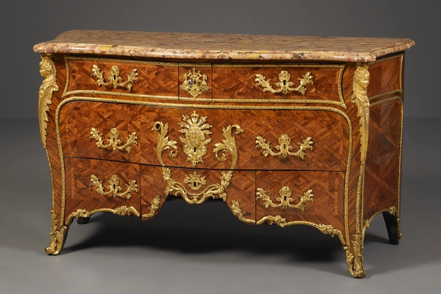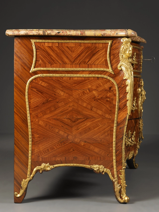 A Régence commode from about 1720-1725 with curved shapes of a model that is commonly referred to as "Commode à Pont". The commode has seven drawers in three layers, of which two without "traverse apparente". The commode with a carcase of oak and pine is decorated with geometric marquetry motifs on the front and the sides in bois de violette. The commode is decorated with ormolu mounts with motifs of espagnolettes, plumed masks, sphinxes and leaf and volute motives. The commode has a Brèche d'Alep marble top. The commode has a curved shape at the front, as well as at the sides. The equally curved jambs rest on small curved legs. The middle part of the skirt has been deepened in the form of an arch. This is where the “Commode à Pont” gets its name from.