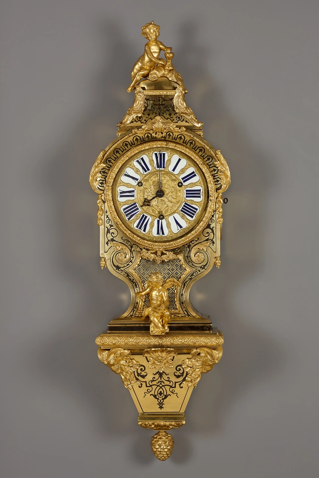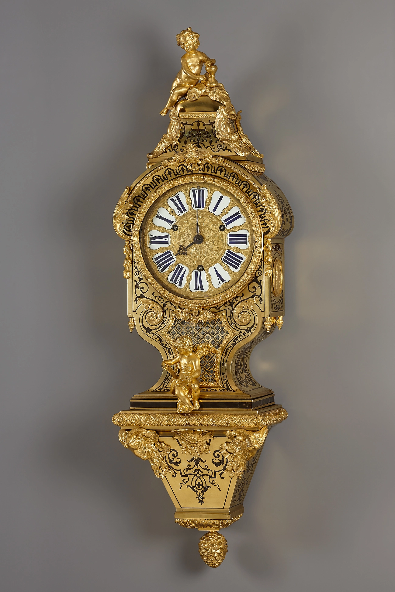 The clock’s design is sometimes referred to as Tête de Poupée (doll’s head) and shows stylistic similarities to the works of André Charles Boulle. The clock is entirely executed in contre-partie Boulle work. The Boulle technique is characterised by the simultaneous cutting of superimposed layers of various materials, creating a series of combinable elements that allow the creation of similar polychromous compositions equal to the number of used materials.