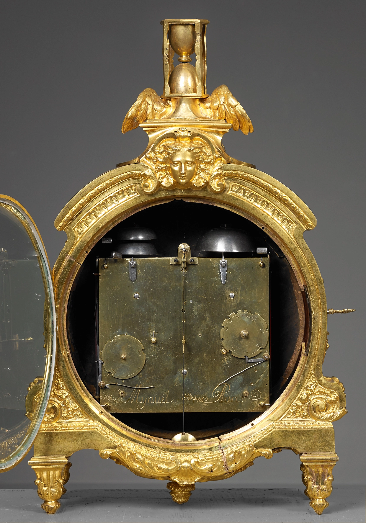 The movement is of three weeks duration with a verge escapement. The clock strikes every fifteen minutes on two bells, every hour on one bell. Louis Mynuel was a clockmaker who worked with a “Privilège du Roy” which means he used to live and work with other artisans in the Louvre, where the king lodged clockmakers, furniture makers and bronze casters who worked for the court.