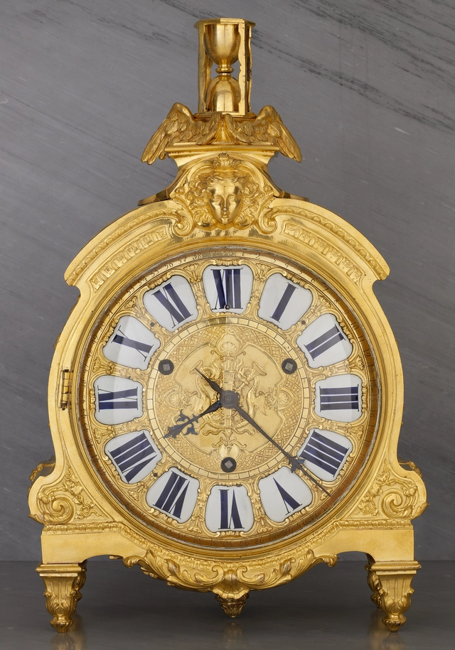 And last but not least: the clock case is of one material only: ormolu or gilt bronze. Boulle used to be one of the first to manufacture clock cases of ormolu without any other material such as wood, brass or tin. Several ormolu table clocks by Boulle can be dated at ca. 1715, for instance the Pendule with Day and Night, of bronze and ormolu which also shows an hourglass and wings (Ottomeyer & Pröschel, vol.I, p.45).
