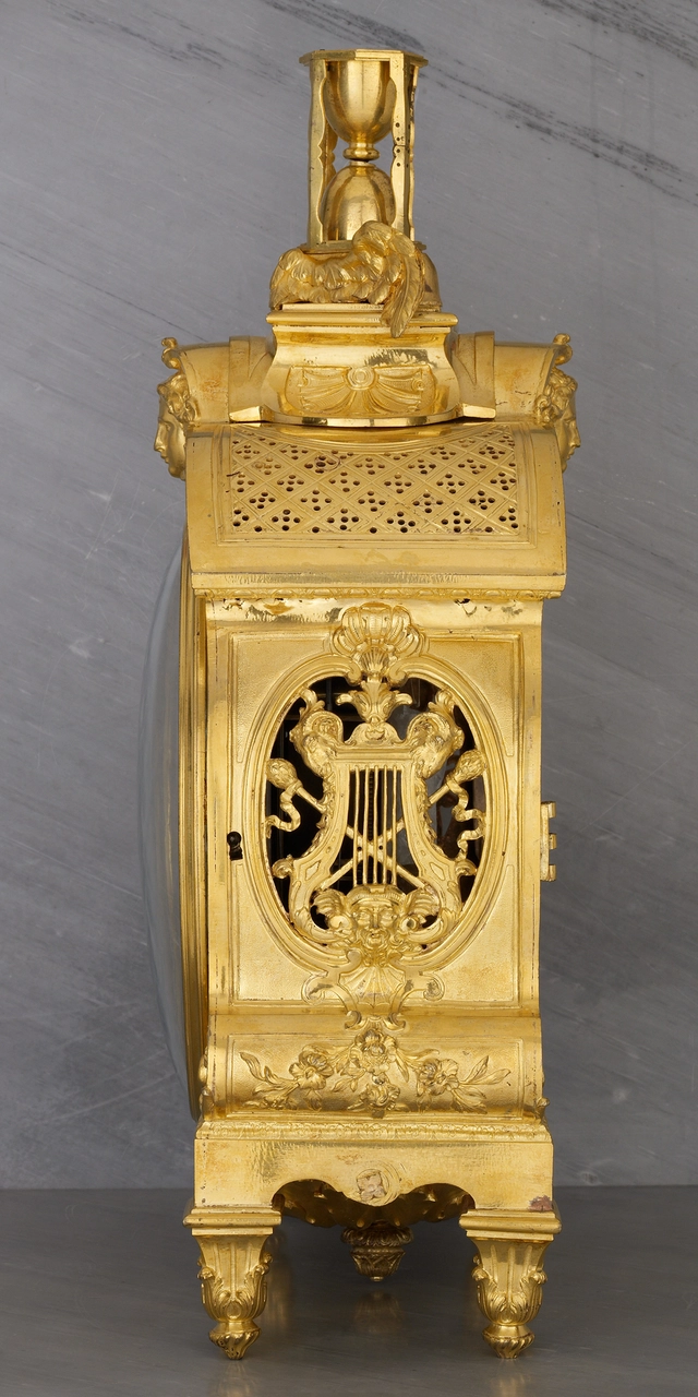 A pendule de cartonnier on four tapering and fluted feet decorated with acanthus leaves. On the front the dial is integrated in the plinth and supported on both sides by C-scrolls with foliate decoration. Under the dial the case is decorated with acanthus leaves flanking a shell. The upper part shows a woman’s mask and is topped by the wings of Time and an hourglass (Tempus fugit; time flies). The underside of the clock is decorated with lavish acanthus foliage around a small pendentive. The sides of the clock case both show a lyre with two Thyrsus rods, a winged male mask and ram’s masks within a C-scroll cartouche. This cartouche is linked to the plinth by scrolls and foliate decoration and linked to the top by shells. The top, under the hourglass and wings, shows shells and a pierced pattern of squares.