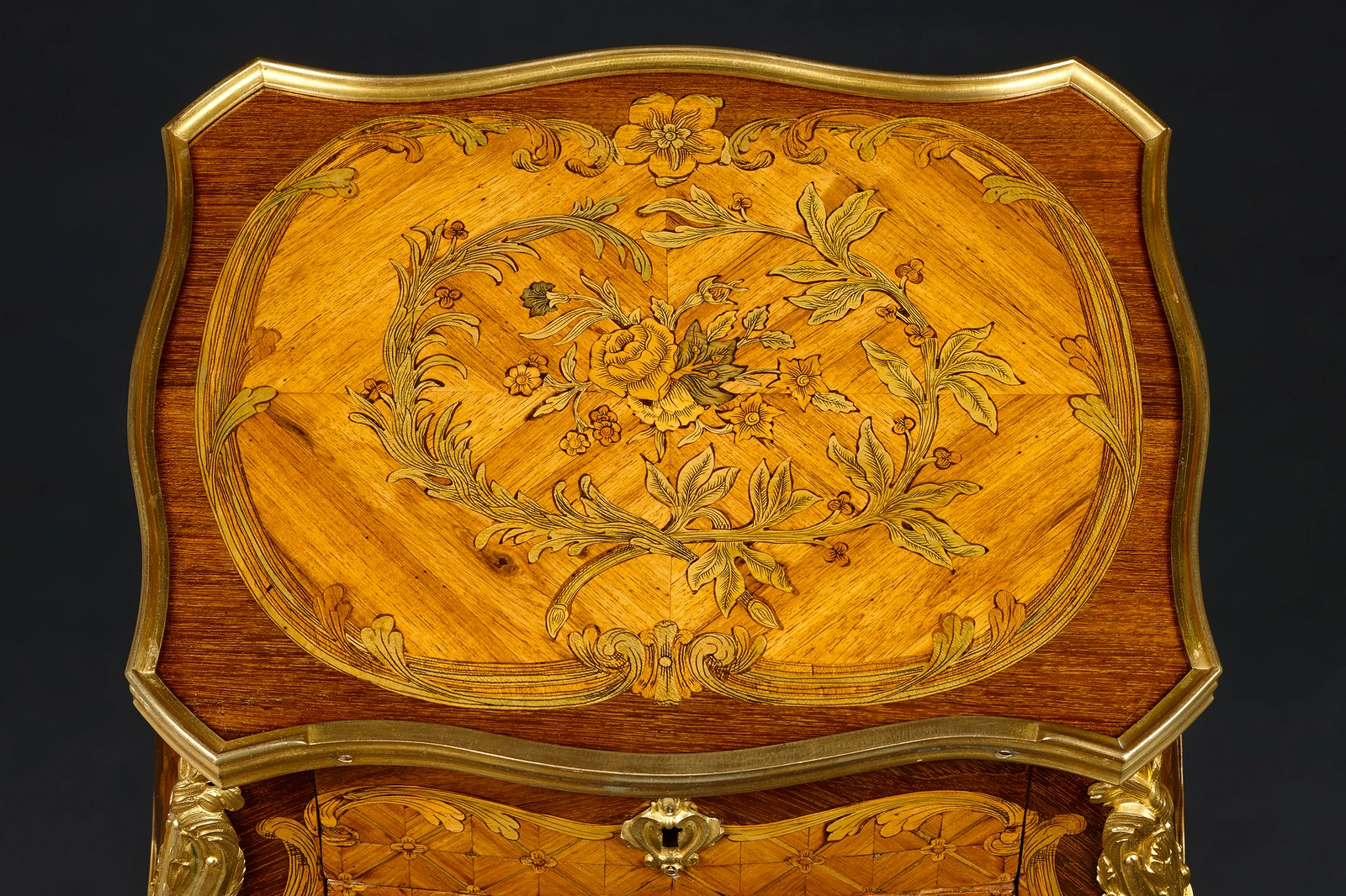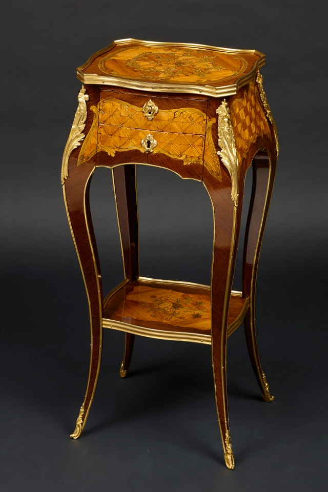 A small and elegant Transitional table with two drawers and ormolu mounts. Decorated overall with a playful line pattern of parquetry, within a floral cartouche surround. The two drawers under the shaped top with floral marquetry can be closed separately. The four slender, cabriole legs are joined by a tier that is loosely conform the shape and marquetry of the top. The furniture piece is lavishly decorated with ormolu fittings and gilt-bronze banding that accentuate its shape and form, including banding along the legs mounted with a scrolled cartouche at the top and a foliate scroll at the foot.