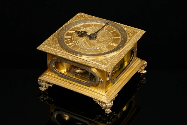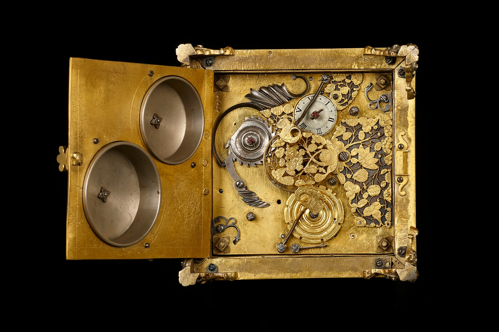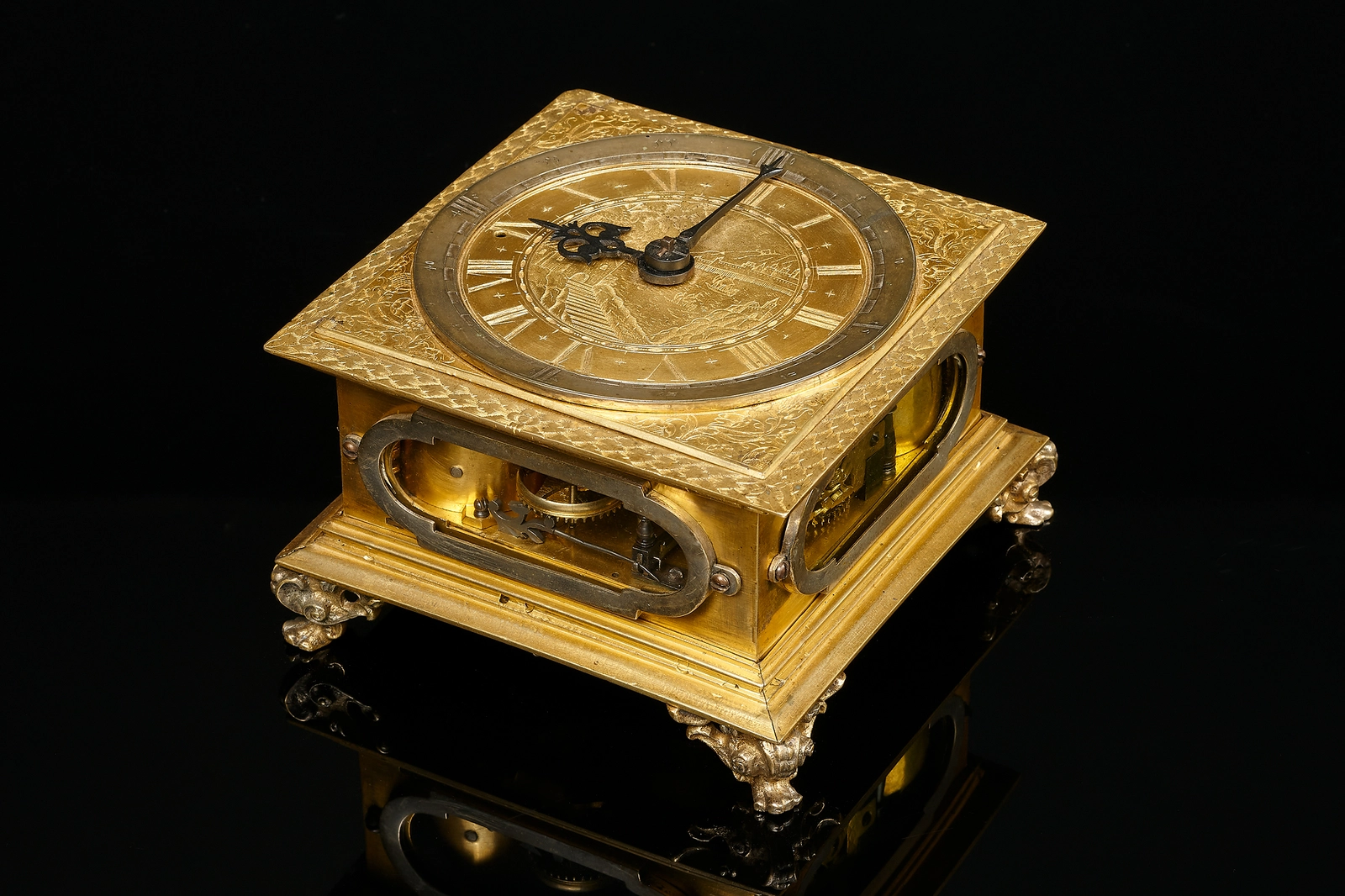 A square German Renaissance box clock from approximately 1615. The brass and bronze case is entirely gilded, with the exception of the rims around the glass windows on the sides and the outer numeral ring. The top of the clock is richly engraved, with a slightly recessed outer border embellished with scales and flowers. In the centre of the box’s top is the dial, which comprises a double numeral ring and, in the centre, a round, engraved landscape with villages and a lake. The outer numeral ring shows the minutes, with Arab numerals for the five-minute intervals and Roman numerals for the quarter-hours. The inner numeral ring notes the hours in Roman numerals, with small engraved crosses between them to mark the half-hours.