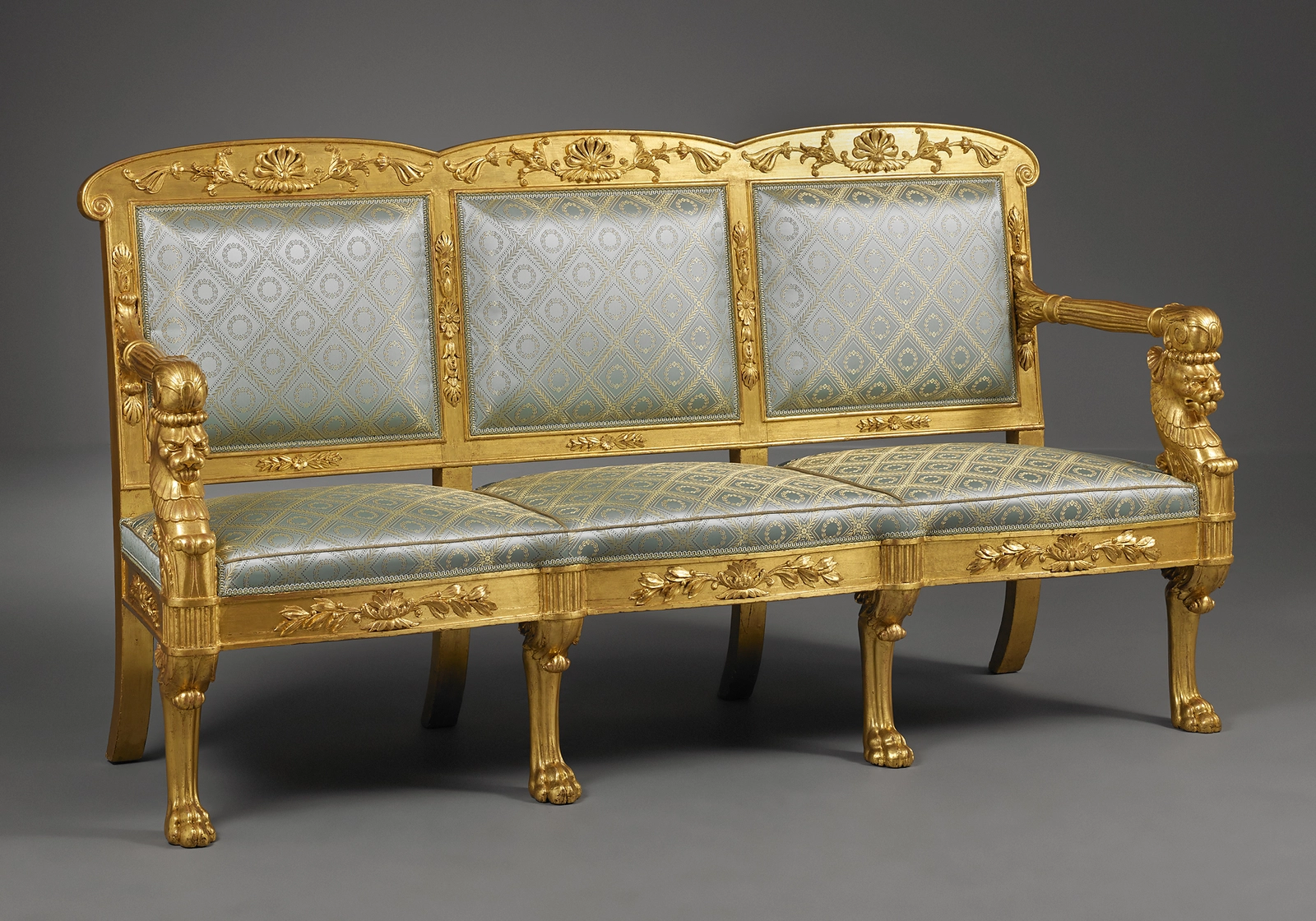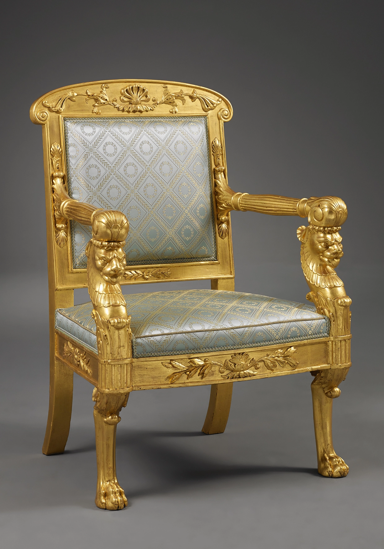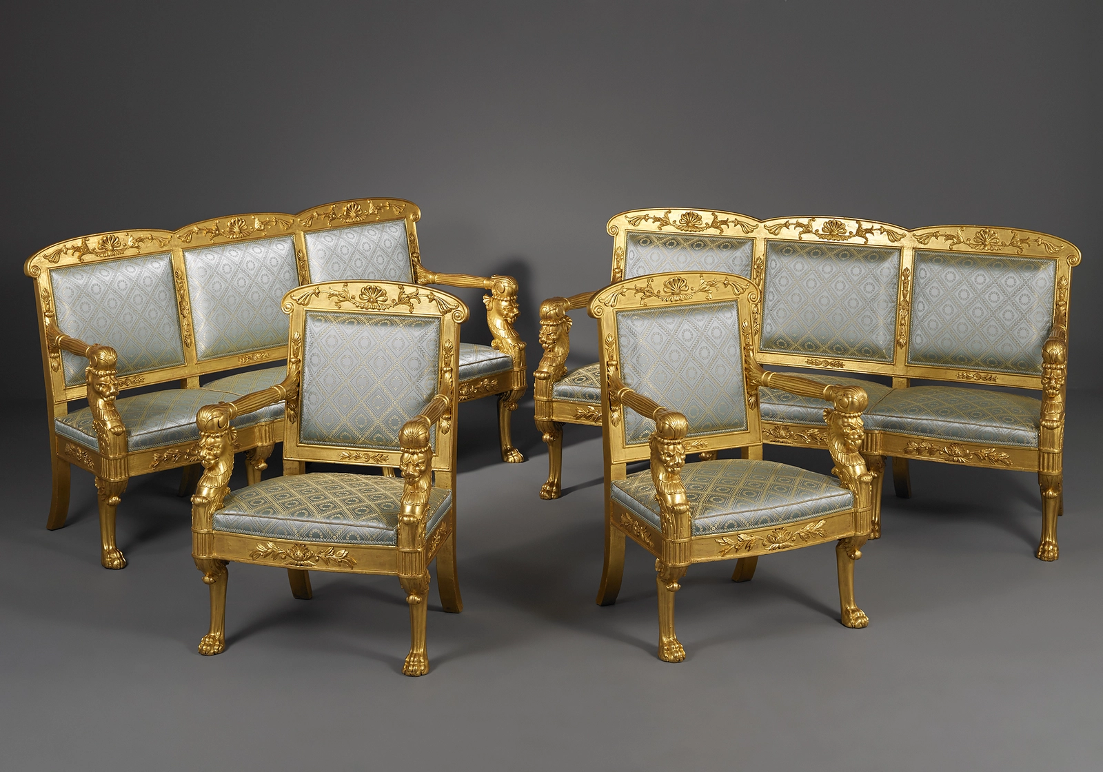 On top of the lions head a rolled piece of textile attached to what seems to be a breast plate of Egyptian inspiration supports the front part of the armrests in the form of a rolled palmette. The fluted armrests are attached to the back of both chairs and sofas in a wealth of foliate ornament and palmettes.