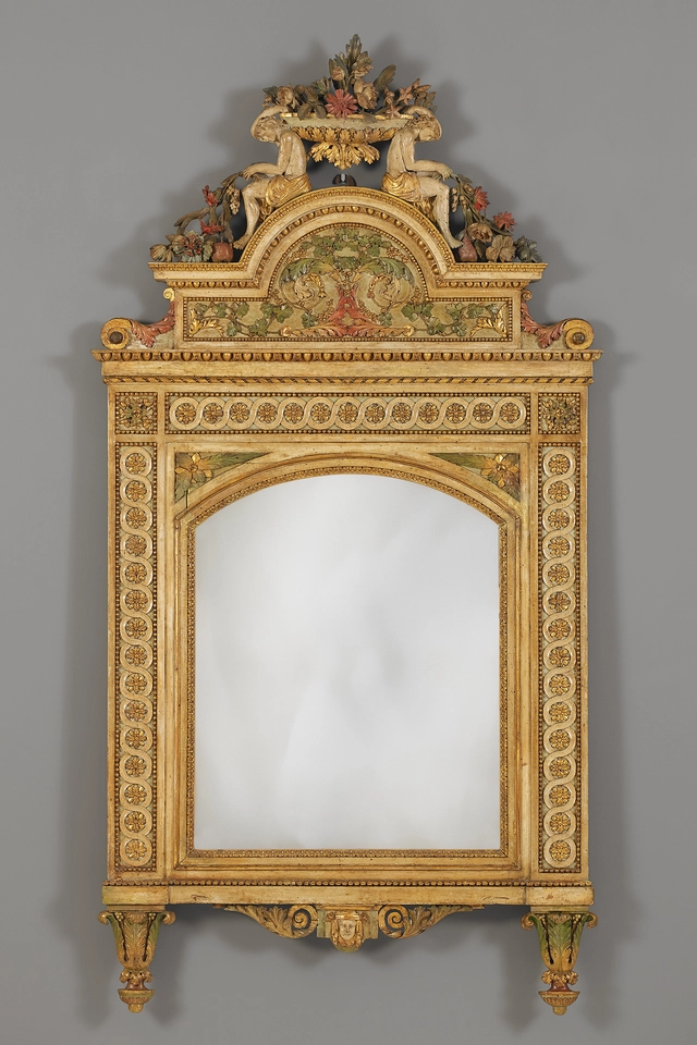 The frieze is decorated with an egg and dart edge and topped with a tympanum adorned with floral branches. The mirror is crowned with two sitting men in a loincloth carrying a flower basket. The figures are each carrying a finely sculpted branch with flowers and fruits.