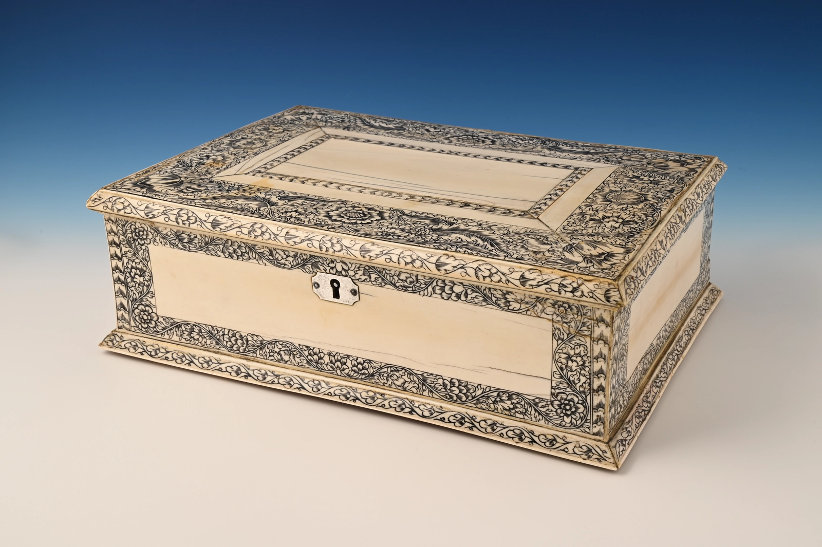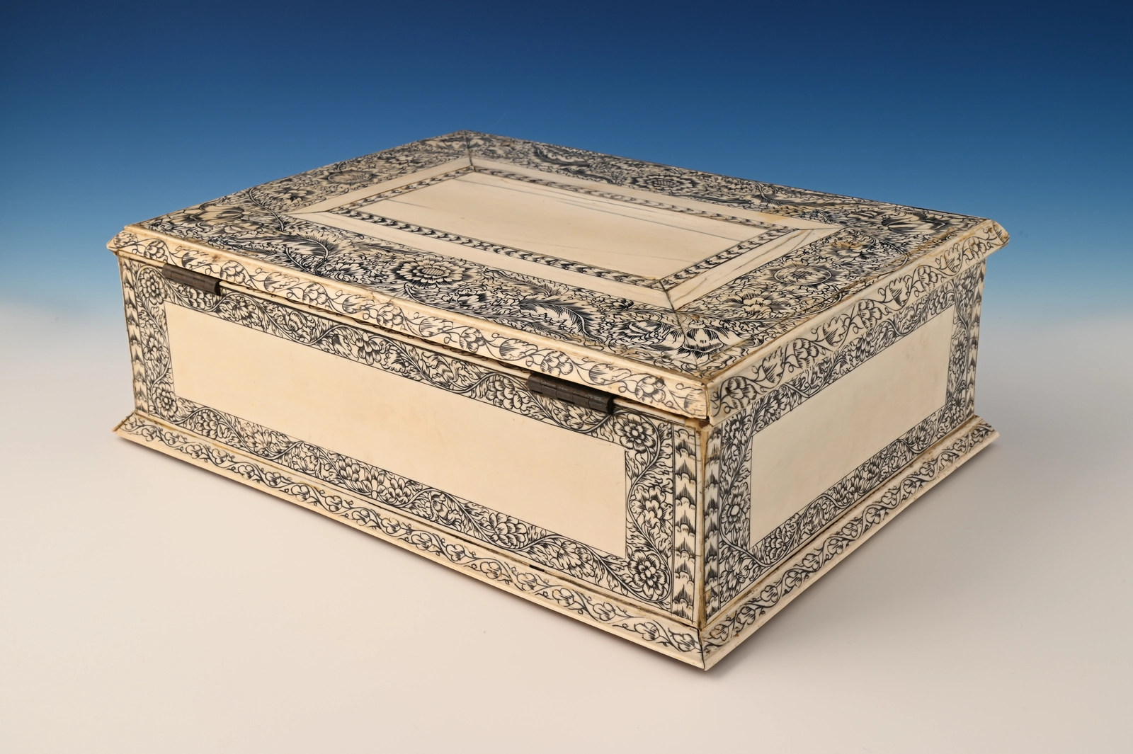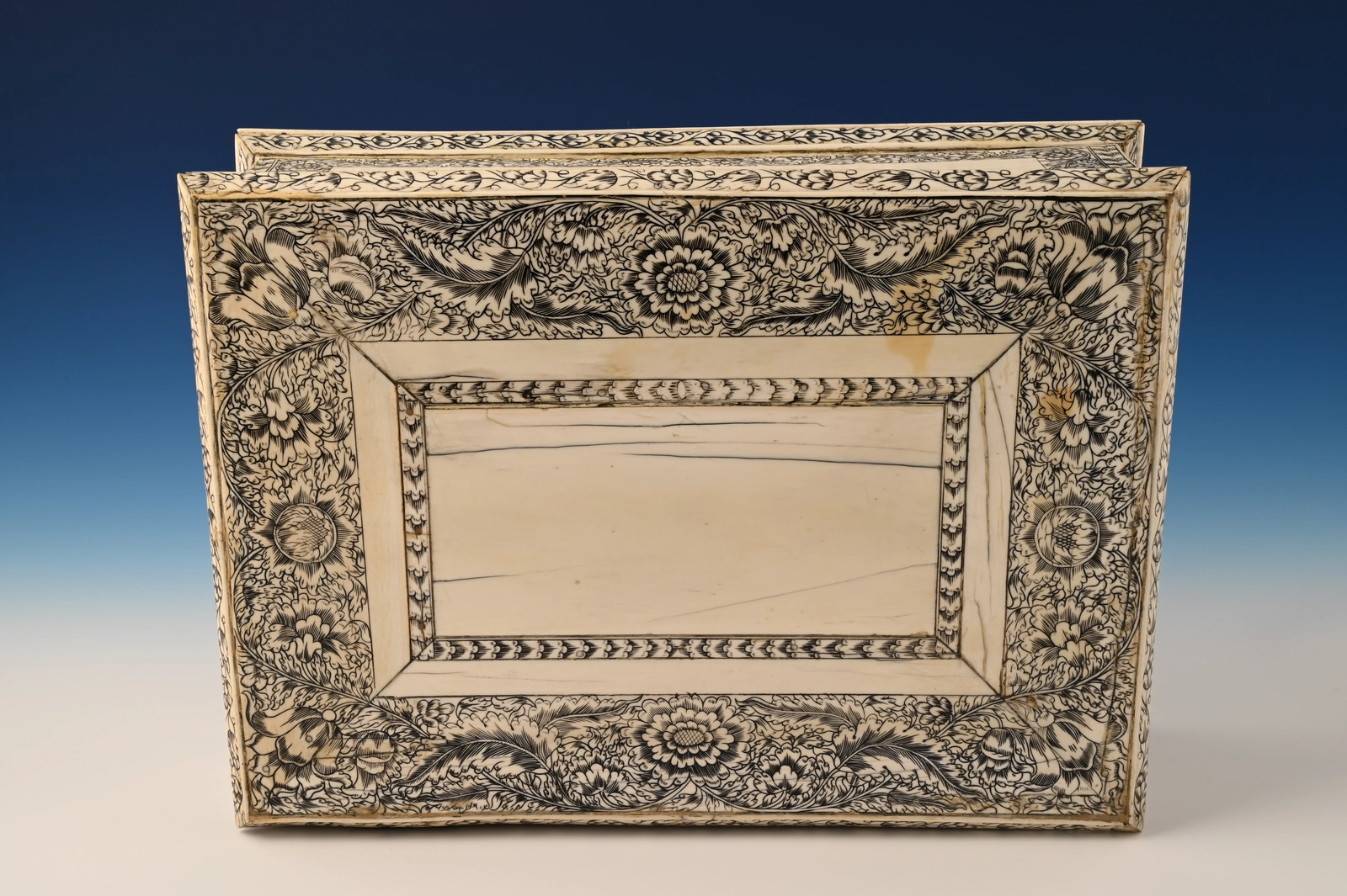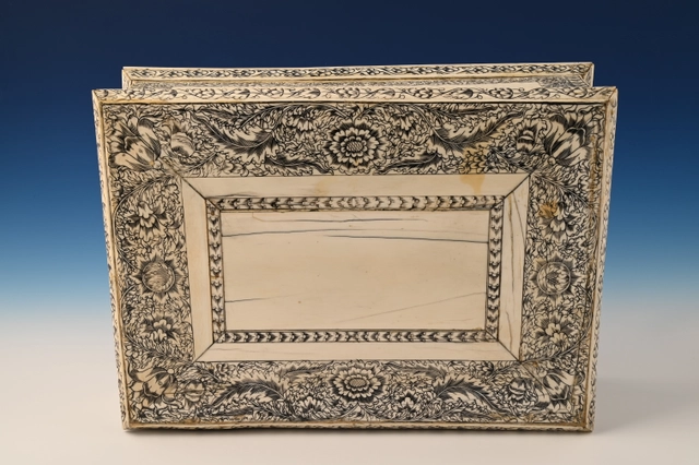 This box is made of sandalwood and covered with engraved ivory, with silver fittings.