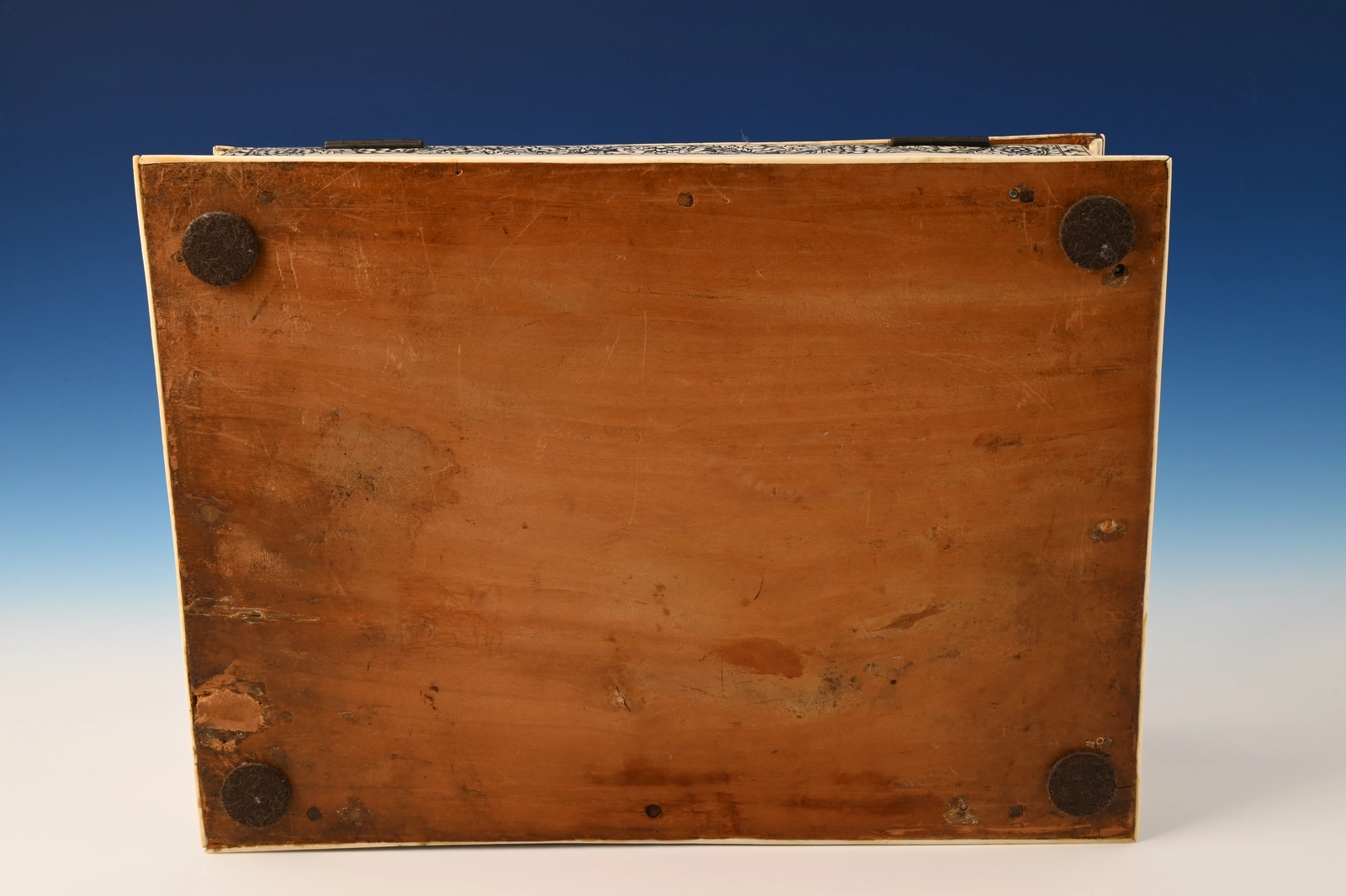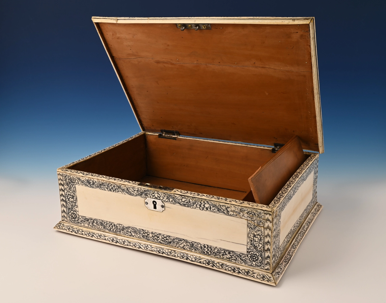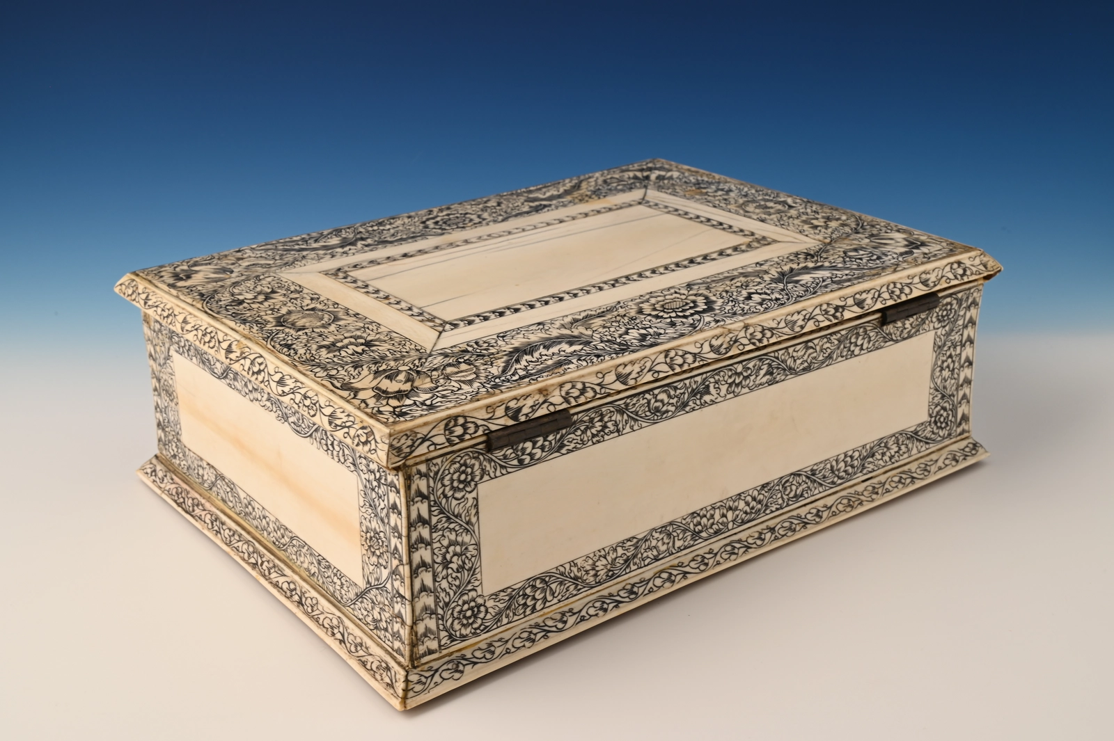 This box is made of sandalwood and covered with engraved ivory, with silver fittings.