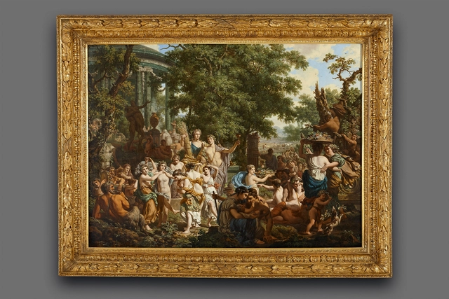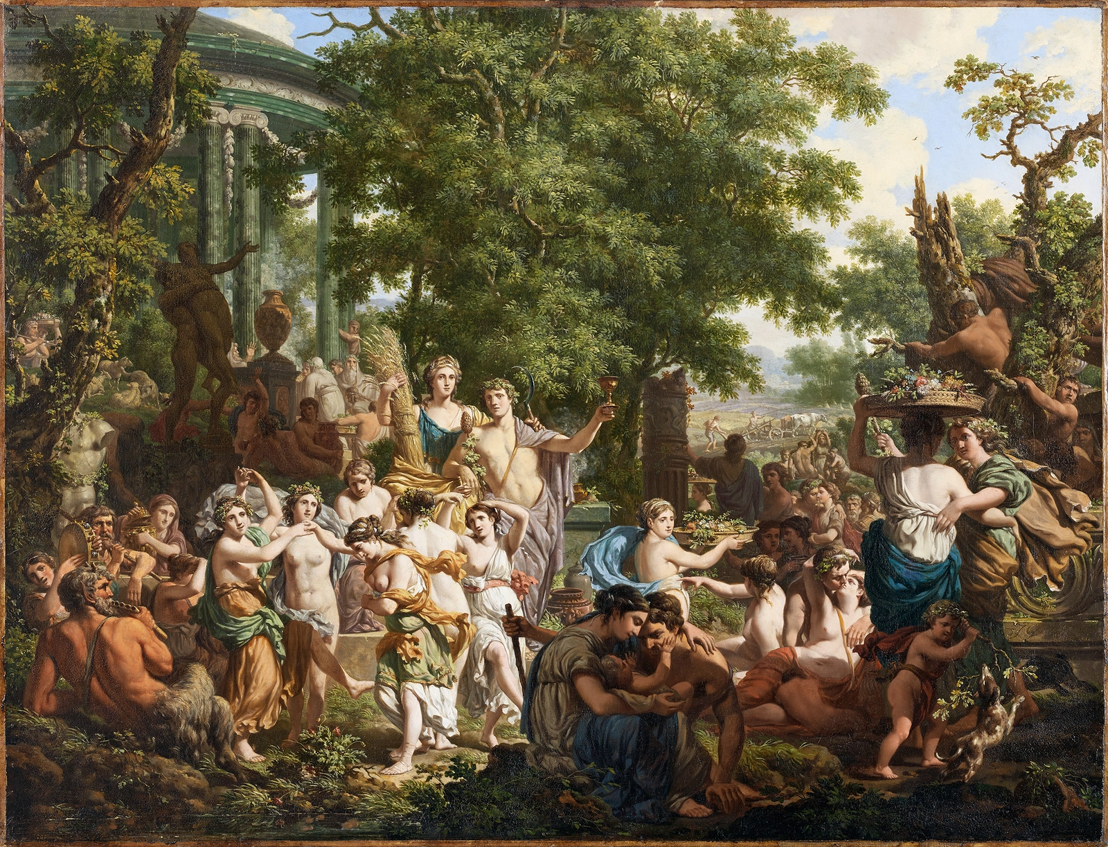 This picture of a feast with the goddess Ceres, a young Bacchus, nymphs and fauns in an Arcadian landscape celebrating the spring is typical for the oeuvre of Jean Grandjean before his journey to Rome. Theme, composition, manner of painting use of color all are closely related to the pictures of his teacher Jurriaan Andriessen. The painting resembles a water-color in the Rijksmuseum (see image on the left), An Arcadian Landscape with a temple in the background. Both the drawing and the painting were once in the collection of Jan Tersteeg. The description of the painting in the auction catalogue of 1808 gives an insight in the specific subject which is chosen here. The landscape where the young Bacchus and Goddess Ceres are celebrating is called Enna. This was in Greek mythology the capital of Sicily, famous for her Demeter cult. Demeter, otherwise known as Ceres, was the sister of Zeus.She had a daughter, Persephone, or Proserpine to the Romans, who was the maiden of Spring.lusted after Persephone.His obsession compelled him to drag her down to the underworld.searched in vain for her lost daughter.Her reproach to the cruel world was to withhold the bounties of the harvest.Demeter discovered the whereabouts of her daughter and pleaded with Zeus for her safe return.arranged a compromise: she would spend half the year in the sunlit uplands and half in the kingdom of Hades. As a result we know the seasons. When Persephone is with her mother it becomes spring, when she returns to Hades it will be winter. In this painting by Grandjean we see how Persephone returns from the underworld and is welcomed by her mother Ceres in spring. In the background farmers are ploughing the fertile grounds. The celebration of Spring is an important rediscovery of a rare painting by Jean Grandjean.