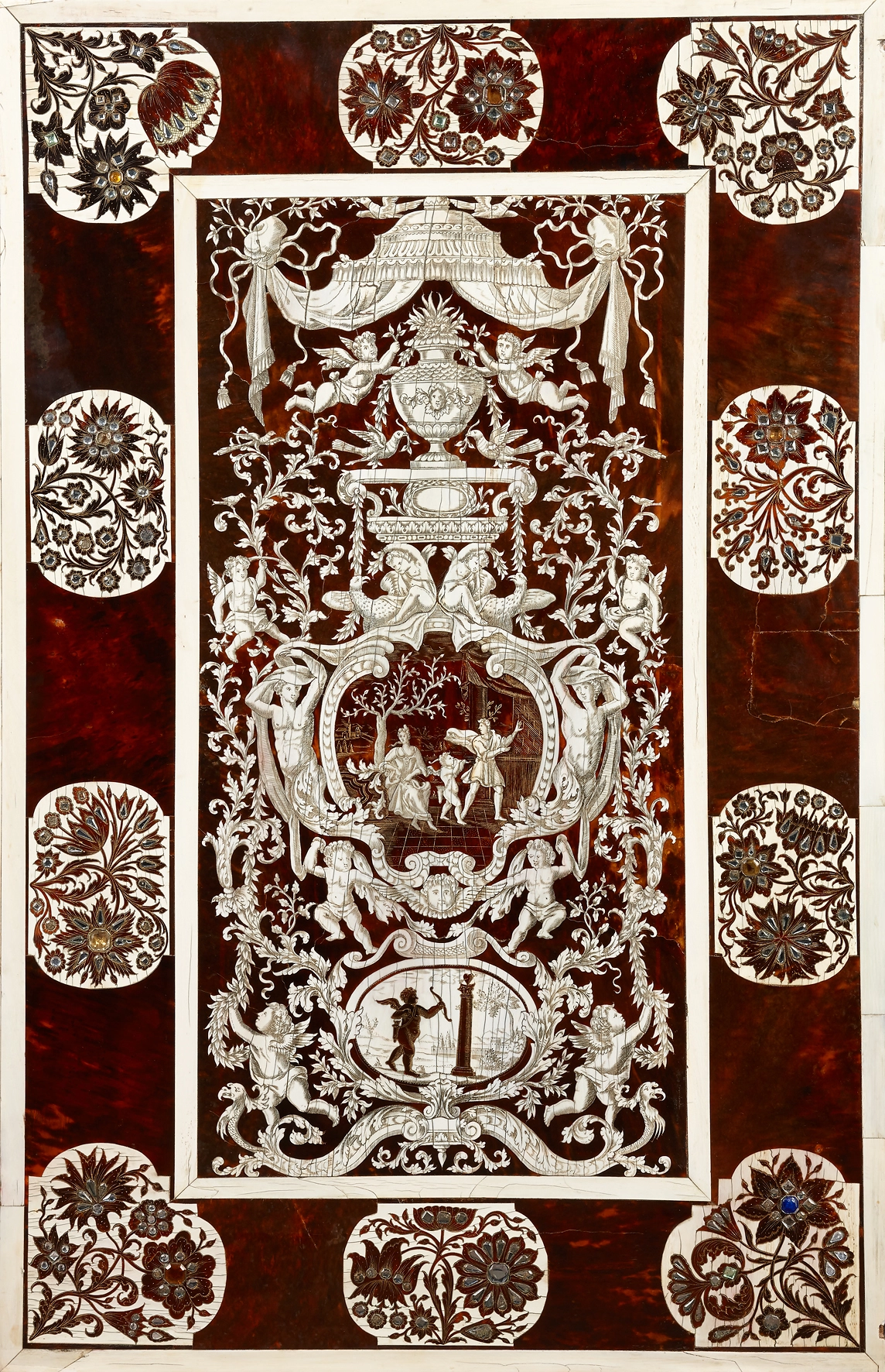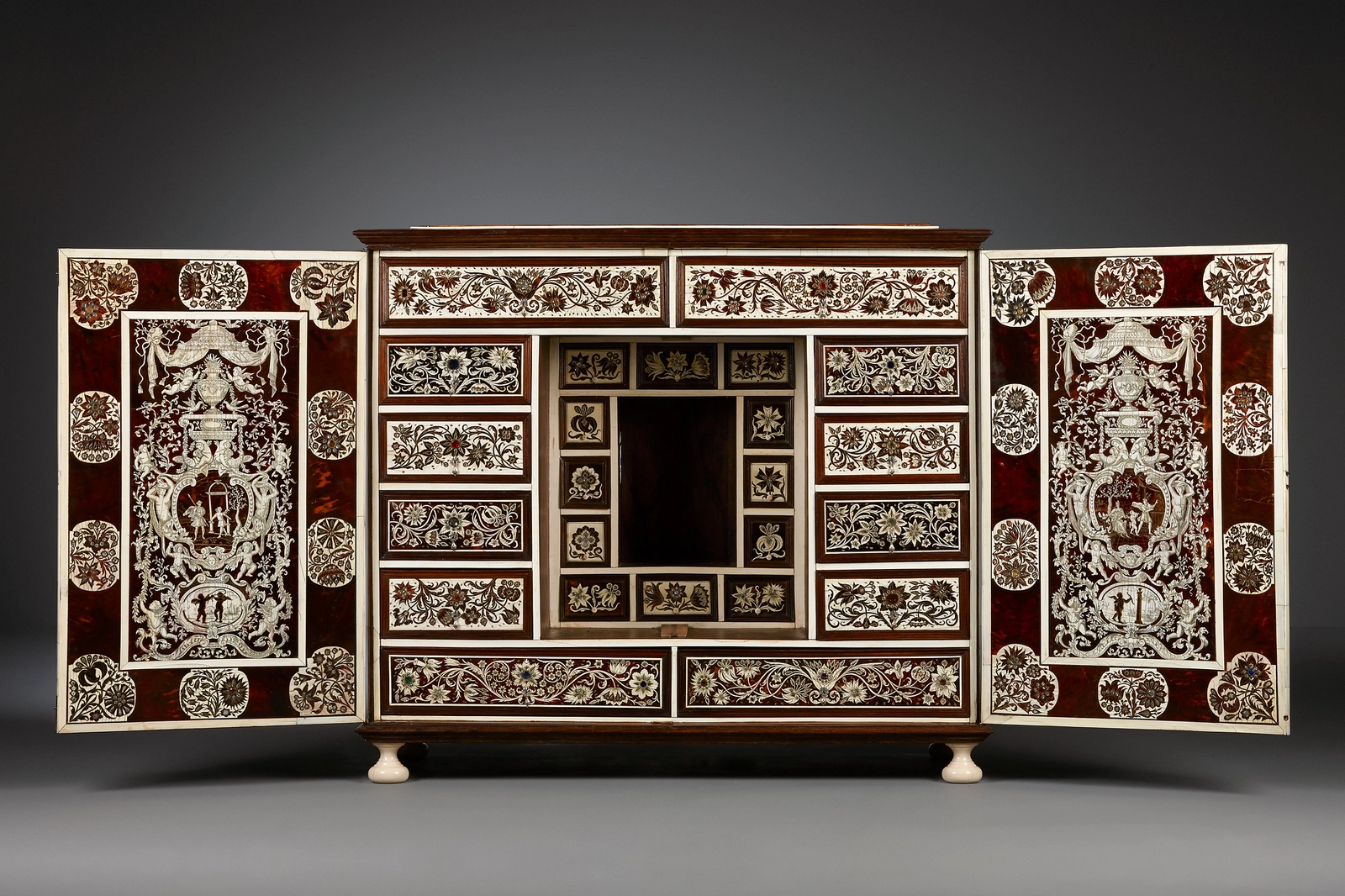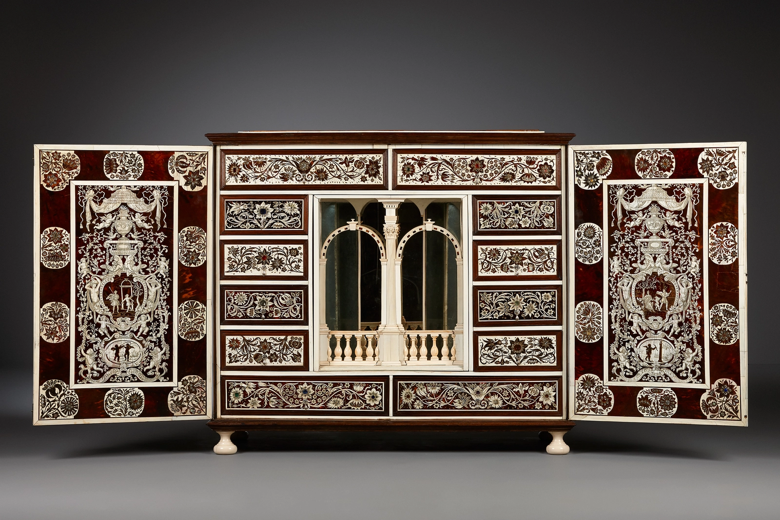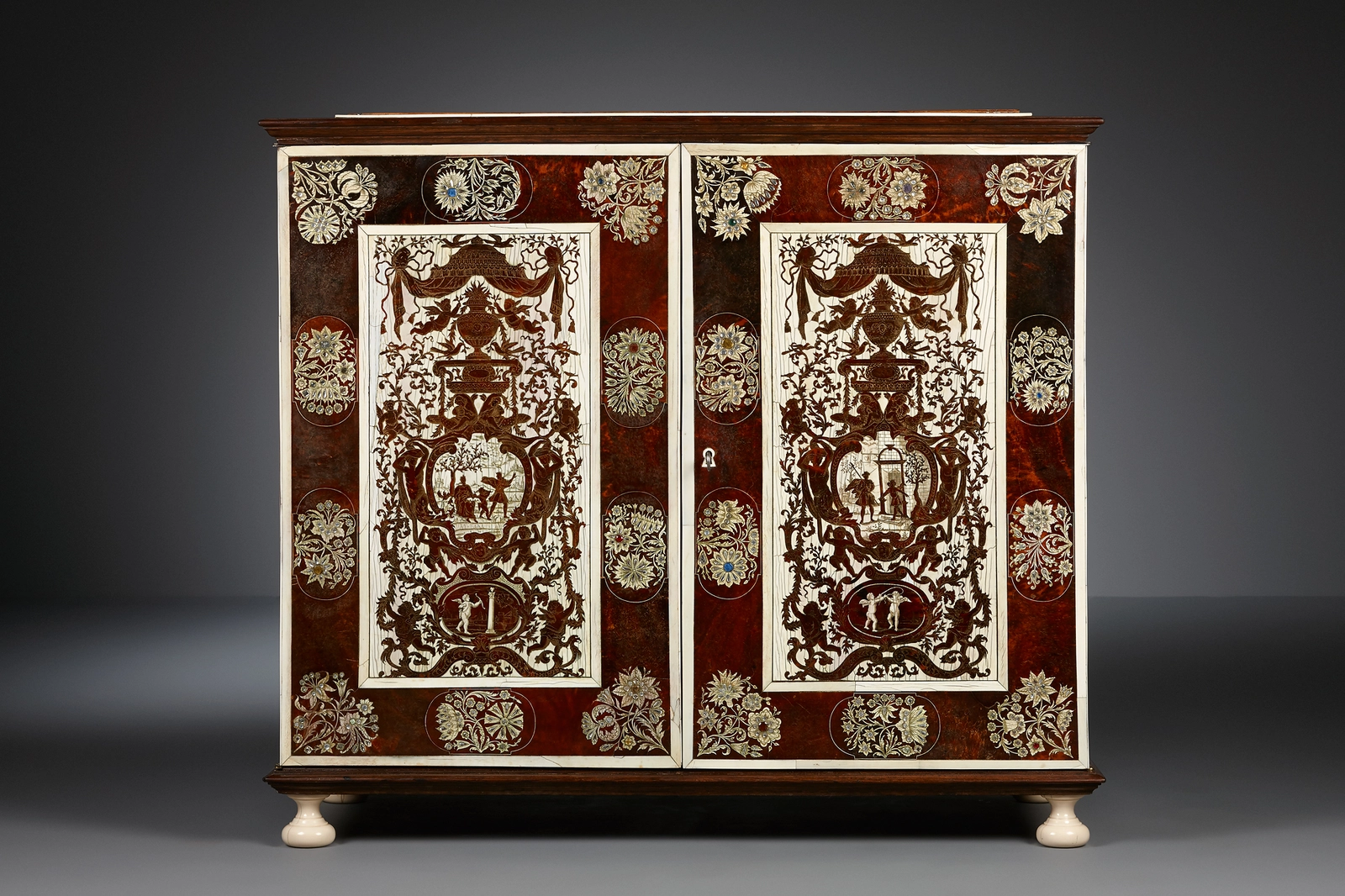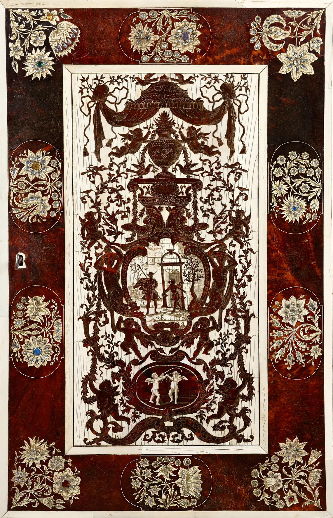 A two-door cabinet standing on four turned feet of solid ivory. The entire cabinet is veneered with tortoiseshell and ivory in première-partie and contre-partie. The cabinet has two large doors, the inner sides of which are also veneered with tortoiseshell and ivory. Behind these doors are twelve drawers: four larger ones at the top and bottom, with eight smaller ones in-between. These drawers can be opened using solid silver pulls. The drawers surround a central open section, which is decorated with a solid ivory Corinthian column aligned with the section’s central axis, flanked by two arches standing upon solid ivory balusters. The section’s “floor” has tortoiseshell and ivory parquetry in a block motif. The section’s inner surfaces are decorated with three mirrors, two of which are oriented diagonally. The section can be removed as a single unit, revealing another twelve smaller drawers behind it. The cabinet’s overall decoration consists of stylised tortoiseshell and ivory flowers, engraved and inlaid with glass and semi-precious stones. The inner and outer doors and sides of the cabinet are decorated with centrally positioned, framed representations of architectural elements, flowers and figures. These representations were inspired by the styles of Daniel Marot (1660/61–1752) and Jean Bérain (1640-1711).