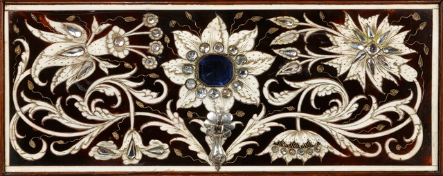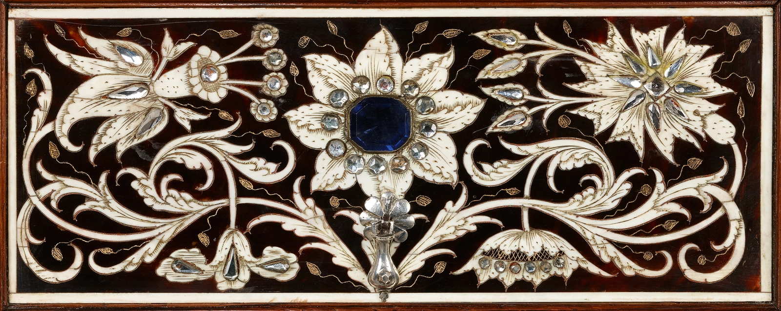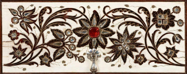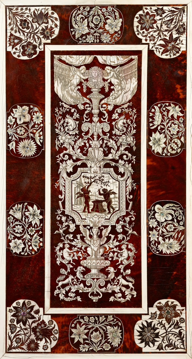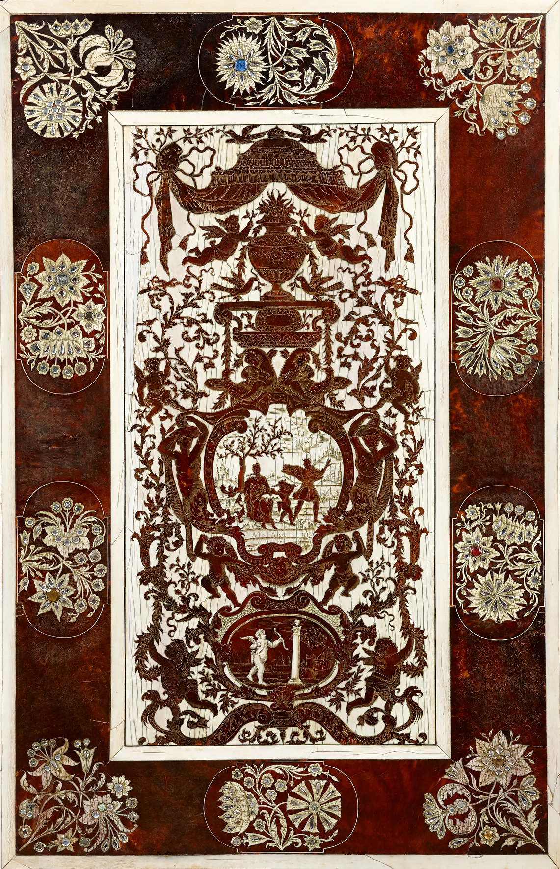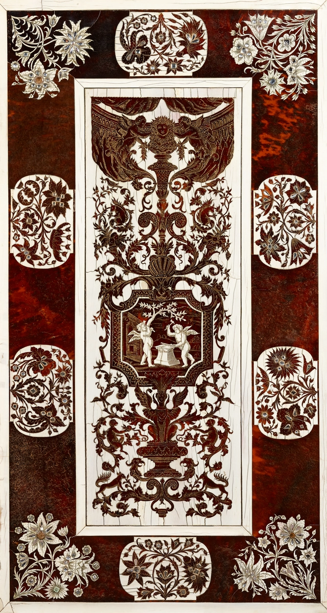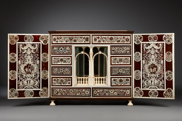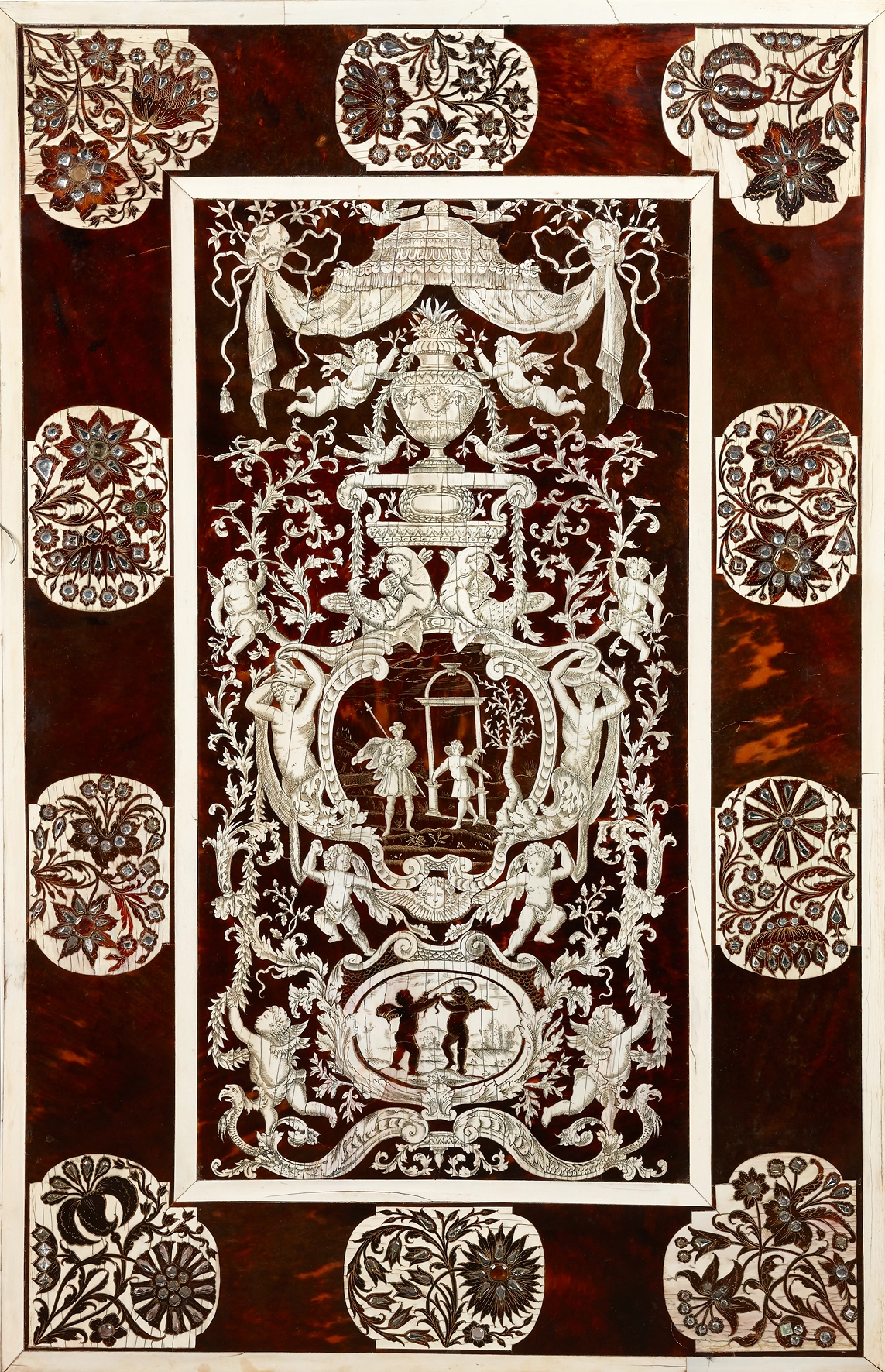 A two-door cabinet standing on four turned feet of solid ivory. The entire cabinet is veneered with tortoiseshell and ivory in première-partie and contre-partie. The cabinet has two large doors, the inner sides of which are also veneered with tortoiseshell and ivory. Behind these doors are twelve drawers: four larger ones at the top and bottom, with eight smaller ones in-between. These drawers can be opened using solid silver pulls. The drawers surround a central open section, which is decorated with a solid ivory Corinthian column aligned with the section’s central axis, flanked by two arches standing upon solid ivory balusters. The section’s “floor” has tortoiseshell and ivory parquetry in a block motif. The section’s inner surfaces are decorated with three mirrors, two of which are oriented diagonally. The section can be removed as a single unit, revealing another twelve smaller drawers behind it. The cabinet’s overall decoration consists of stylised tortoiseshell and ivory flowers, engraved and inlaid with glass and semi-precious stones. The inner and outer doors and sides of the cabinet are decorated with centrally positioned, framed representations of architectural elements, flowers and figures. These representations were inspired by the styles of Daniel Marot (1660/61–1752) and Jean Bérain (1640-1711).