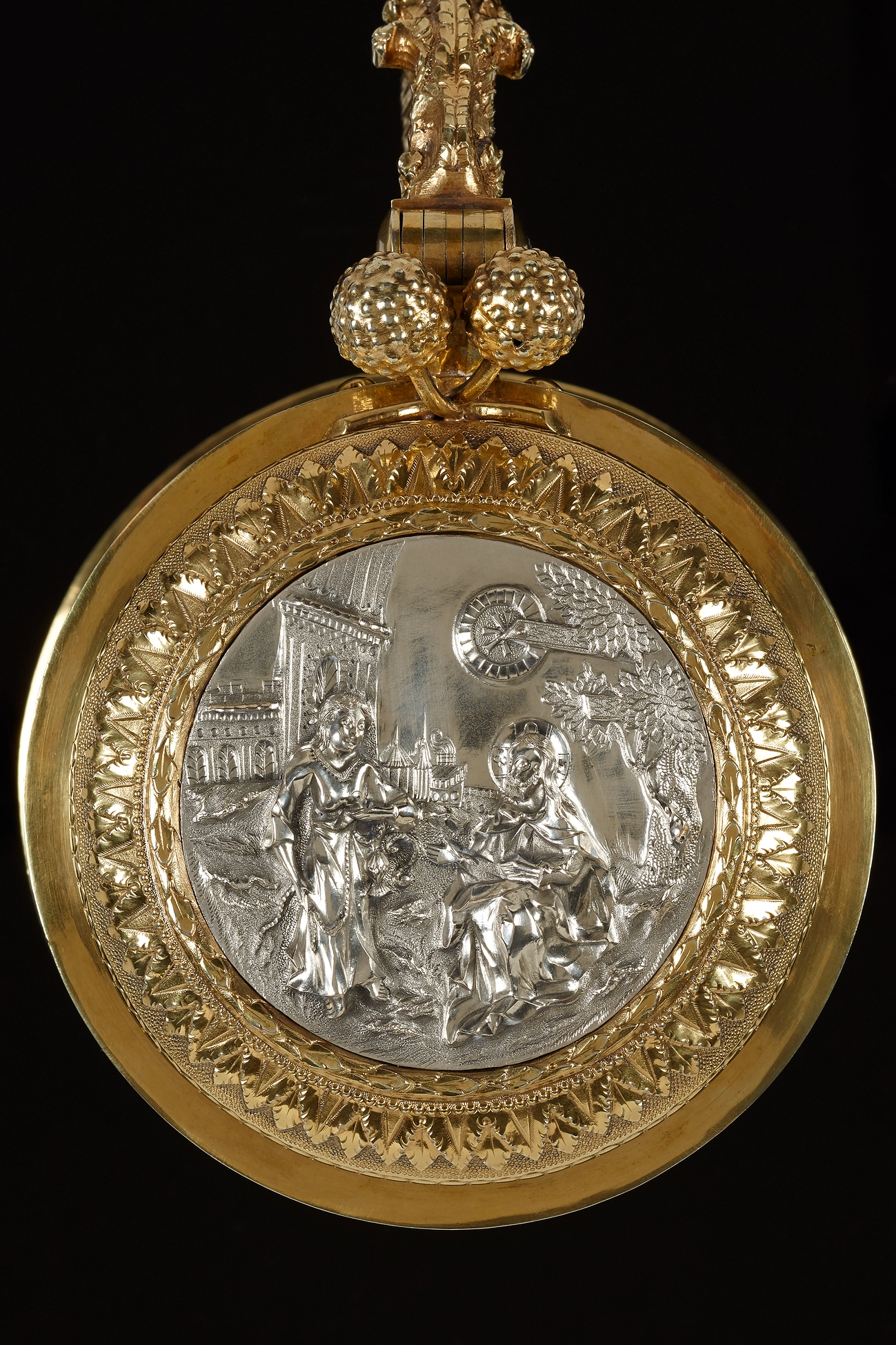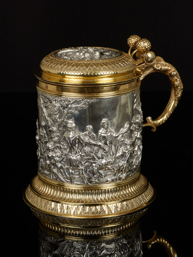 The cylindrical body, embossed with an elaborate Old Testament scene, derived from Exodus 17, Moses striking the rock for water in front of the elders of Israel, is placed on a silver-gilt spreading base with fluted border above a border of stylized foliage. The upper silver-gilt border is plain between reeding. The hinged domed lid is set with a silver roundel, embossed with a New Testament scene, John 4: 1- 42, representing Jesus’ encounter with the Samaritan woman at the well. A small laurel wreath border and a broader border of stylized foliage on a matted ground above a protruding plain rim surround the silver roundel. The cast silver-gilt double scroll handle displays scrolling foliage and flower heads. Two berries, applied to the lid rim, form the thumb rest. The body and the lid display a gilt interior. Fully marked at the reverse of base and displaying assay stripes. Stamped with inventory number 182 and painted Nl, a crown between and in red CT. CFP and 182.