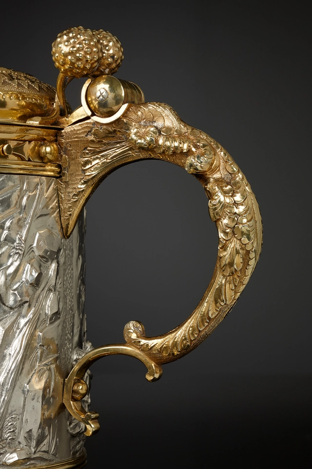 Based on of the silver alloy, which is below 700/ 1000, the attribution to Transylvania has been made. However, this type of tankard in a higher alloy, above 700/1000, was also made in German speaking countries. Transylvanian silver objects were usually made in a lower silver alloy. Therefore, it is likely this tankard was made in Rumania by an extraordinary skilled silversmith, who succeeded to superbly chase the body in high relief, using silver low in alloy.
