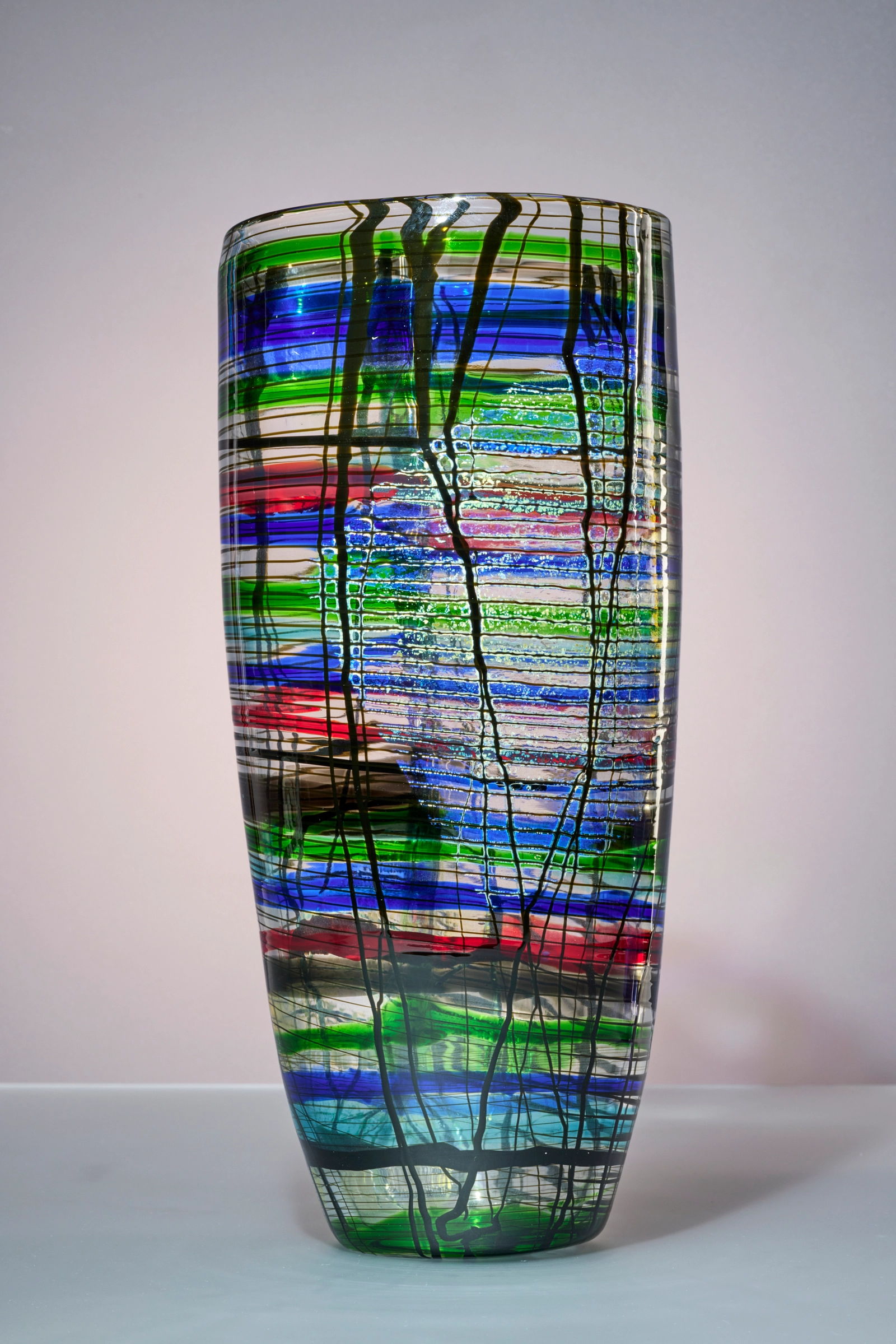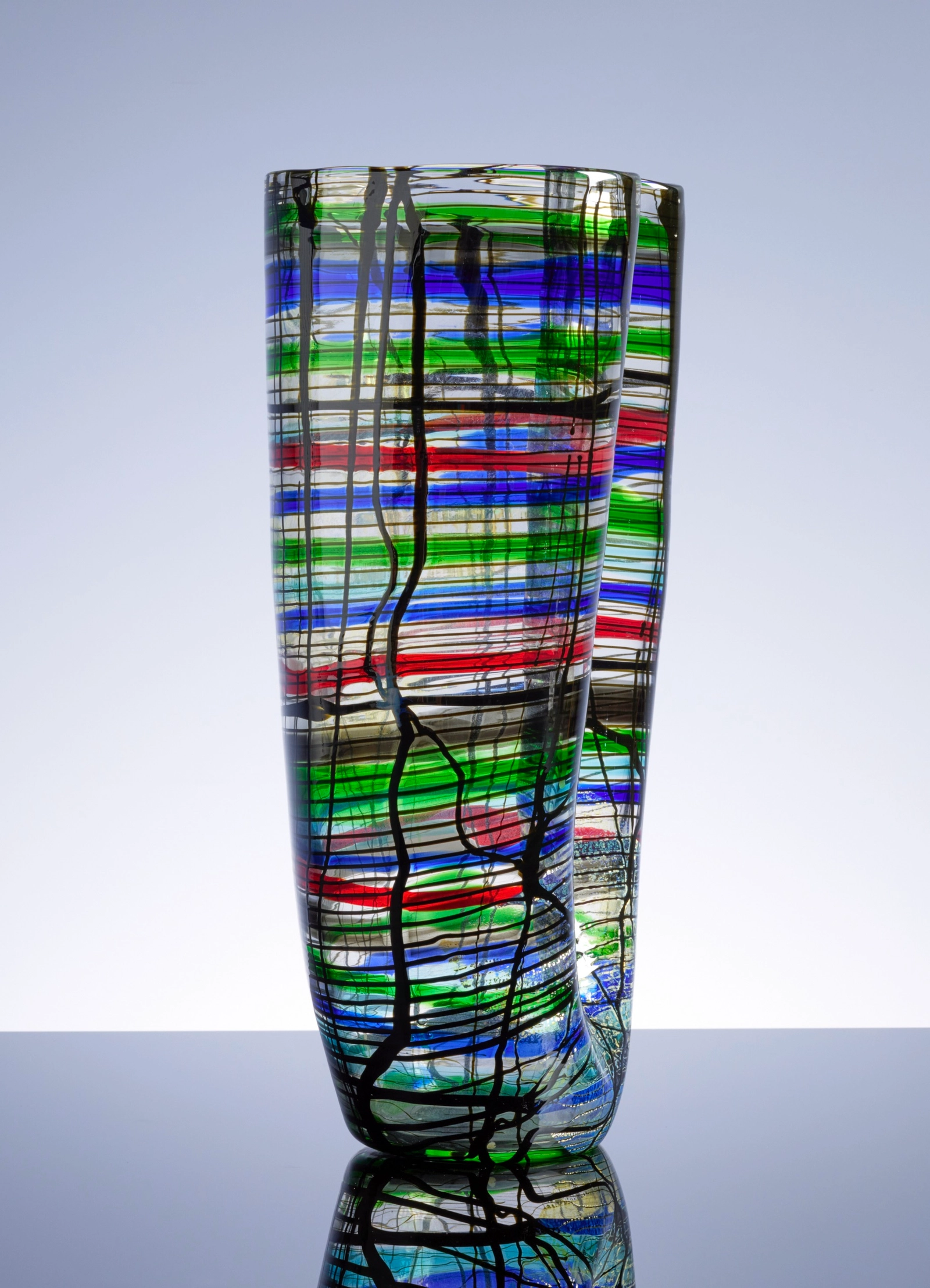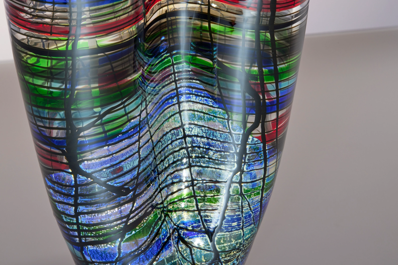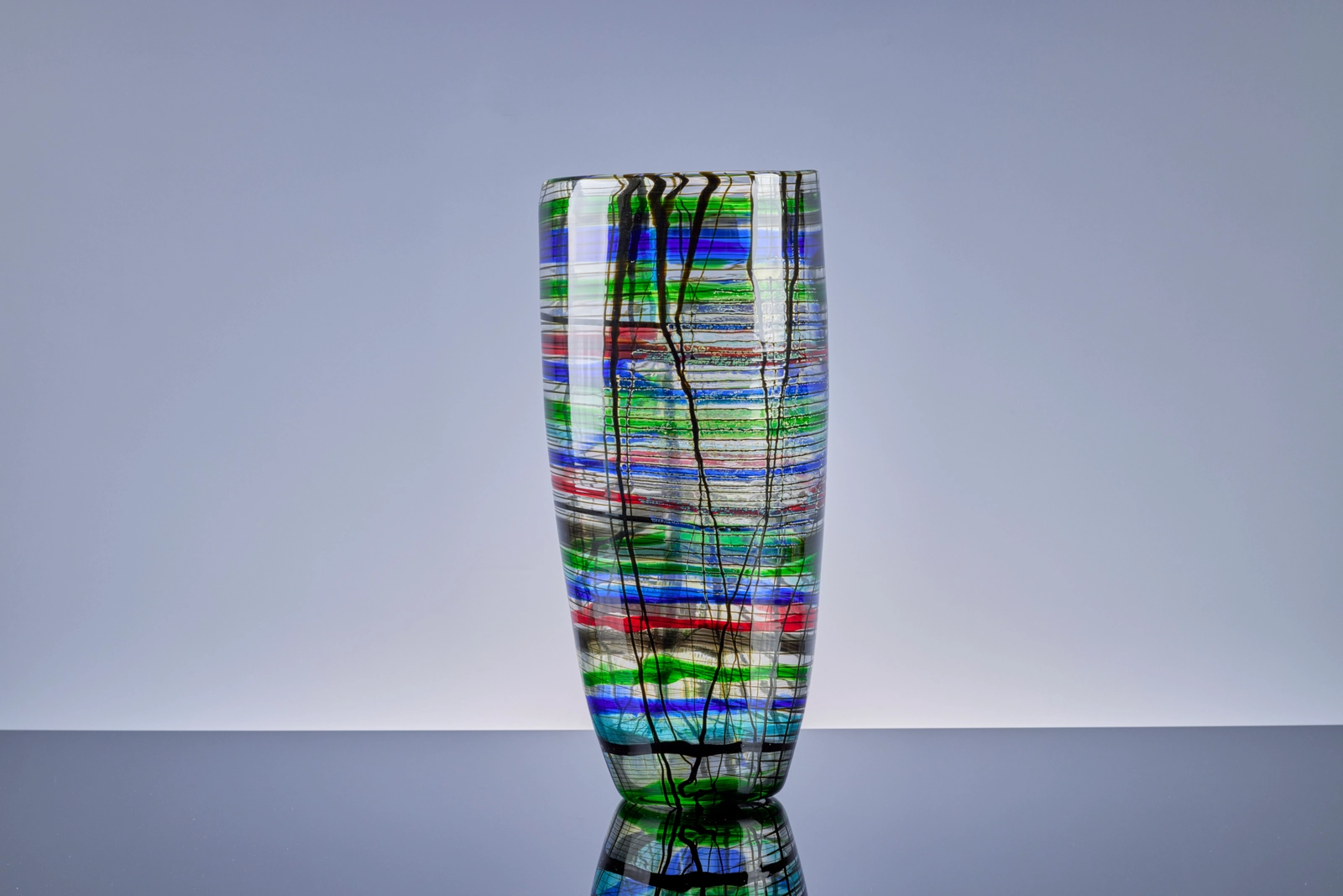 Lino Tagliapietra (Murano 1934), Notte del Redentore, clear glass vase with multi-coloured horizontal and vertical glass threads