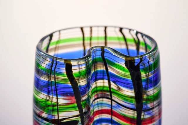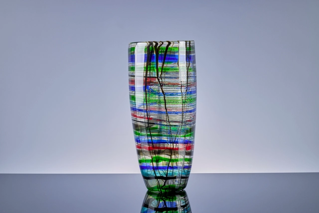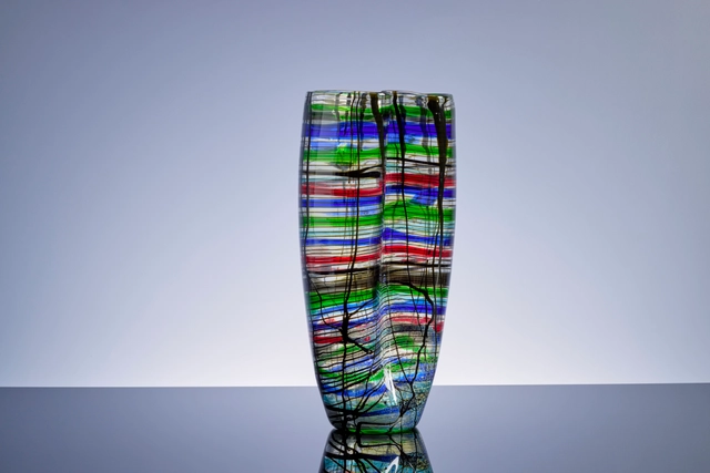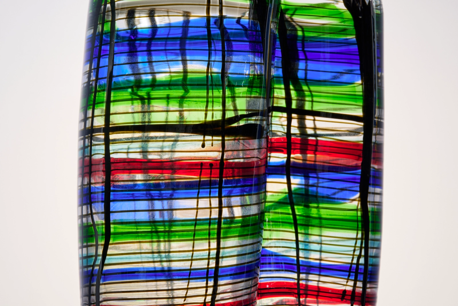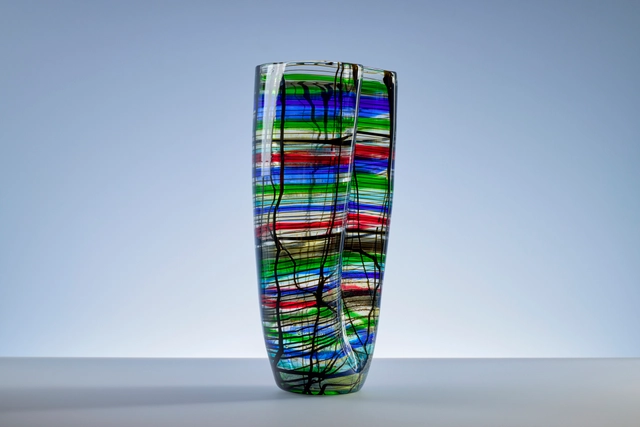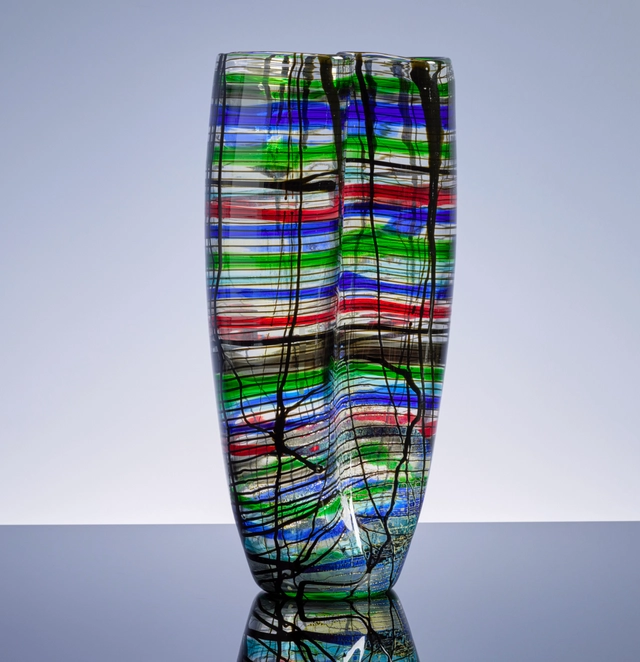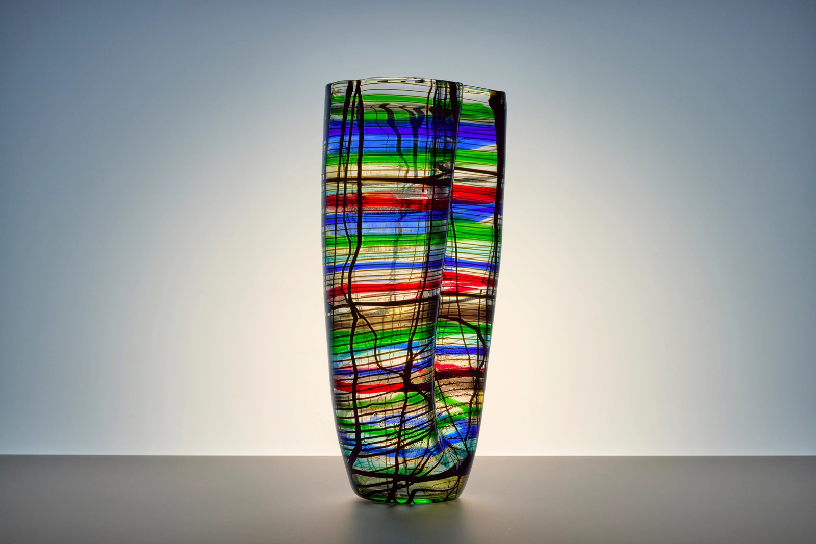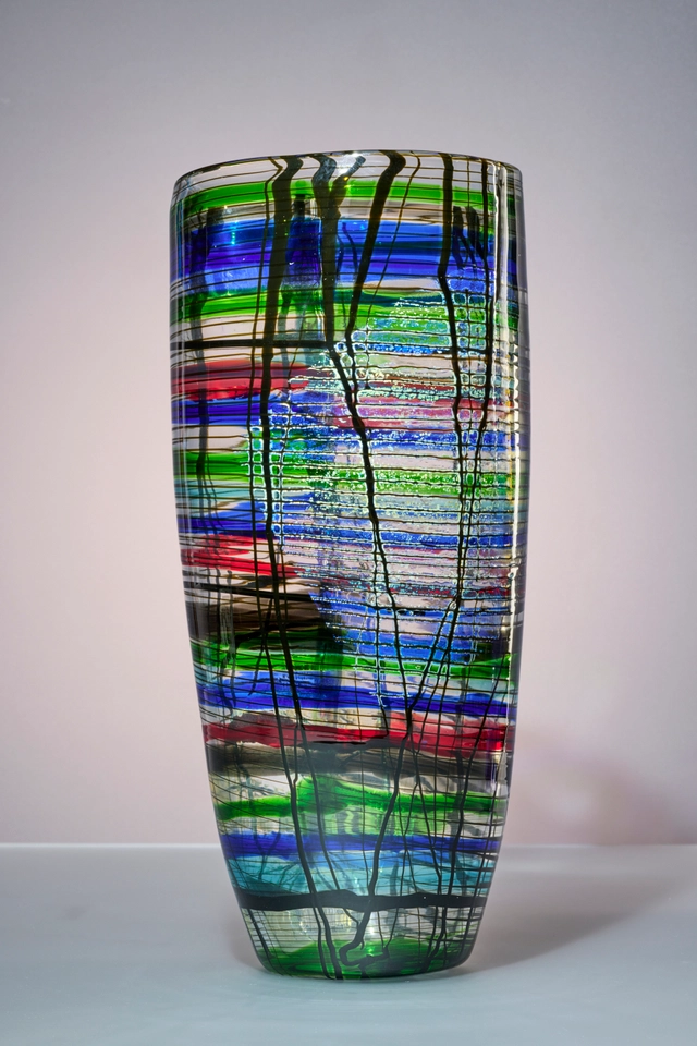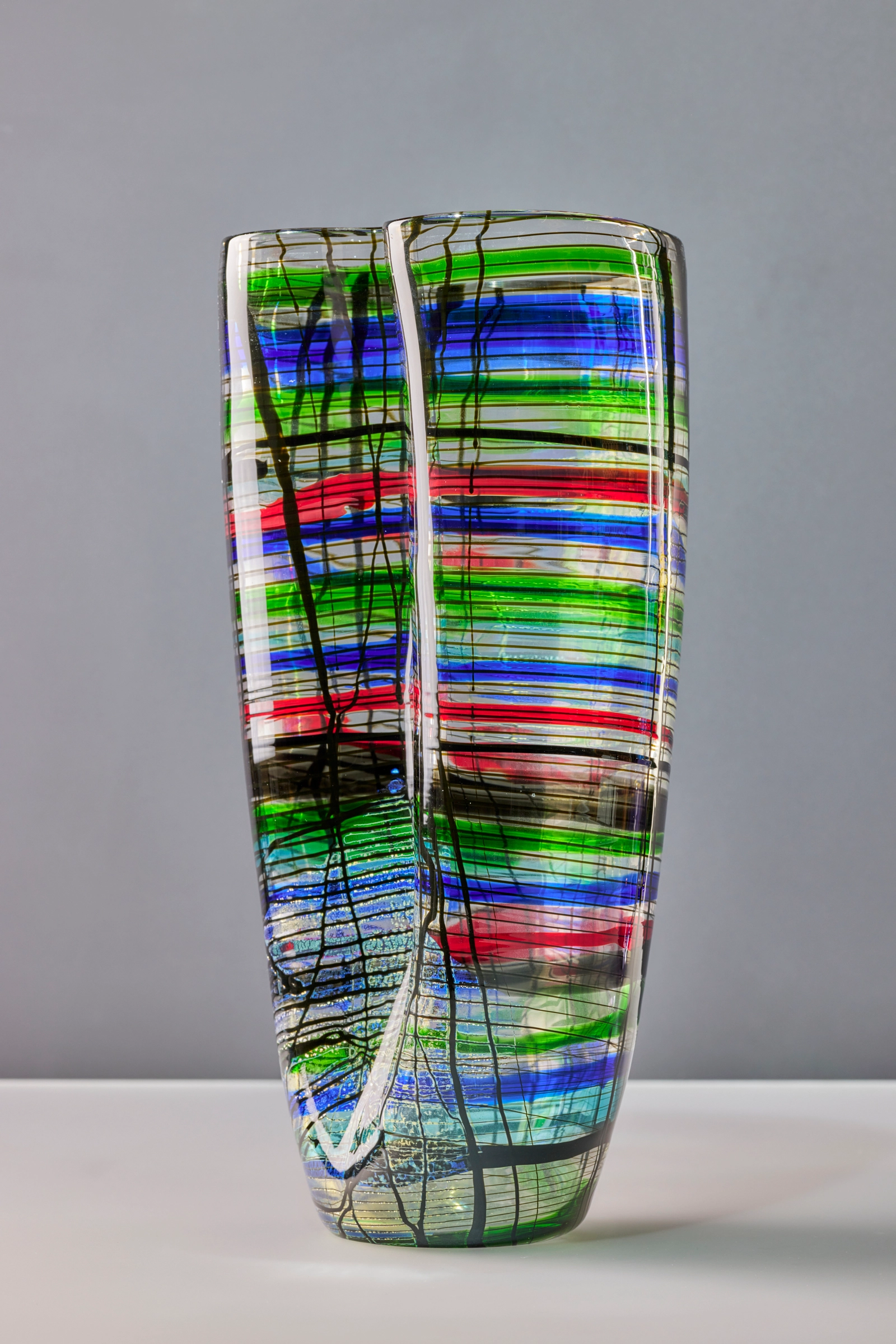 Lino Tagliapietra (Murano 1934), Notte del Redentore, clear glass vase with multi-coloured horizontal and vertical glass threads
