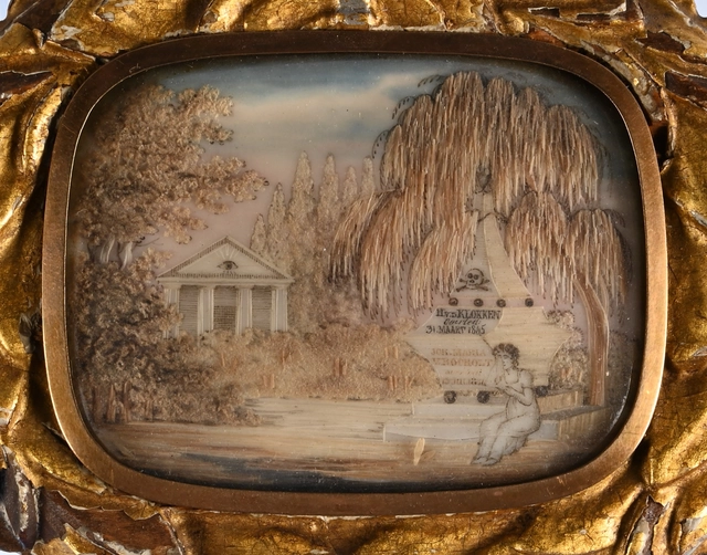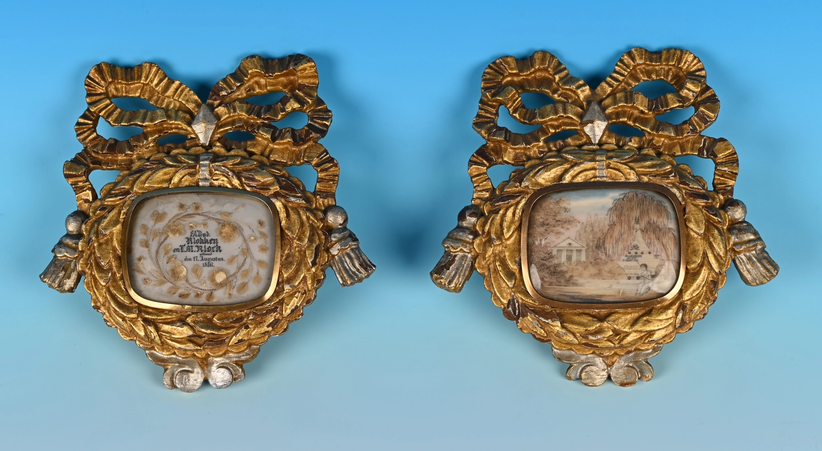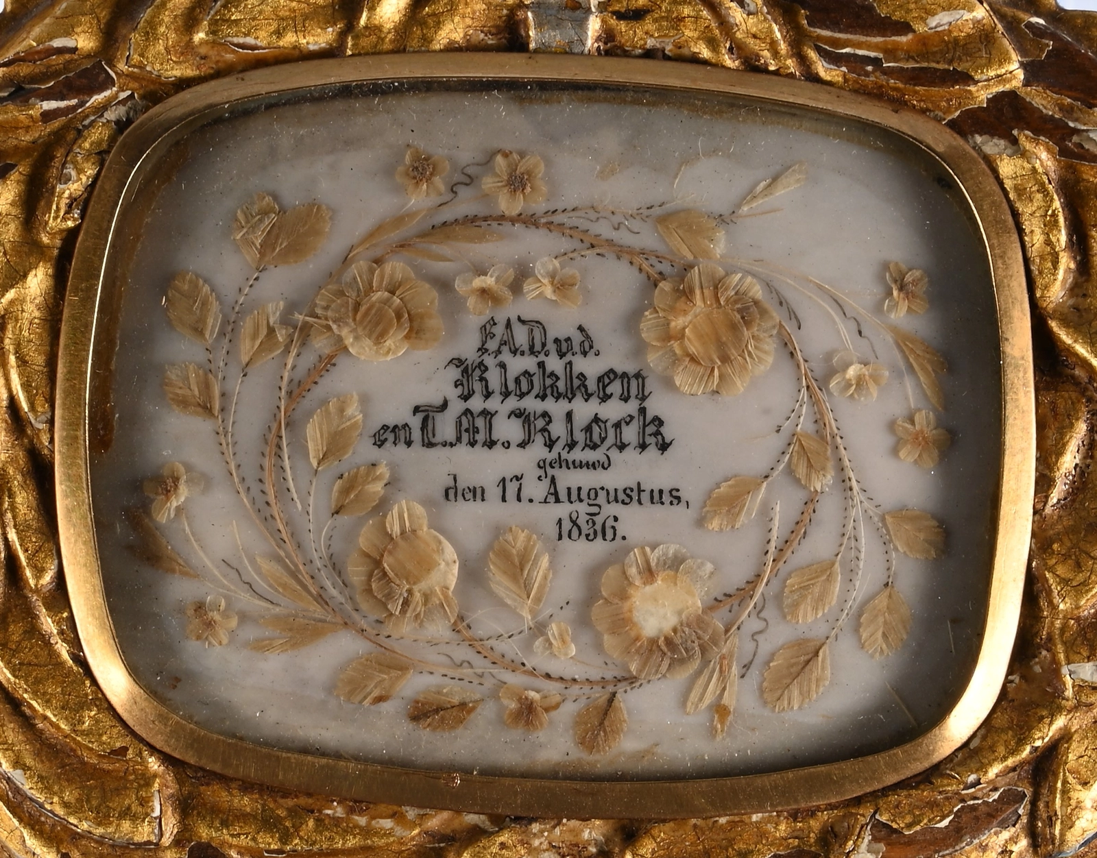Two very fine hairpieces in the original beautifully carved gilt wood frames remembering marriage and passed away of the Klokken family in 1836 and 1845.