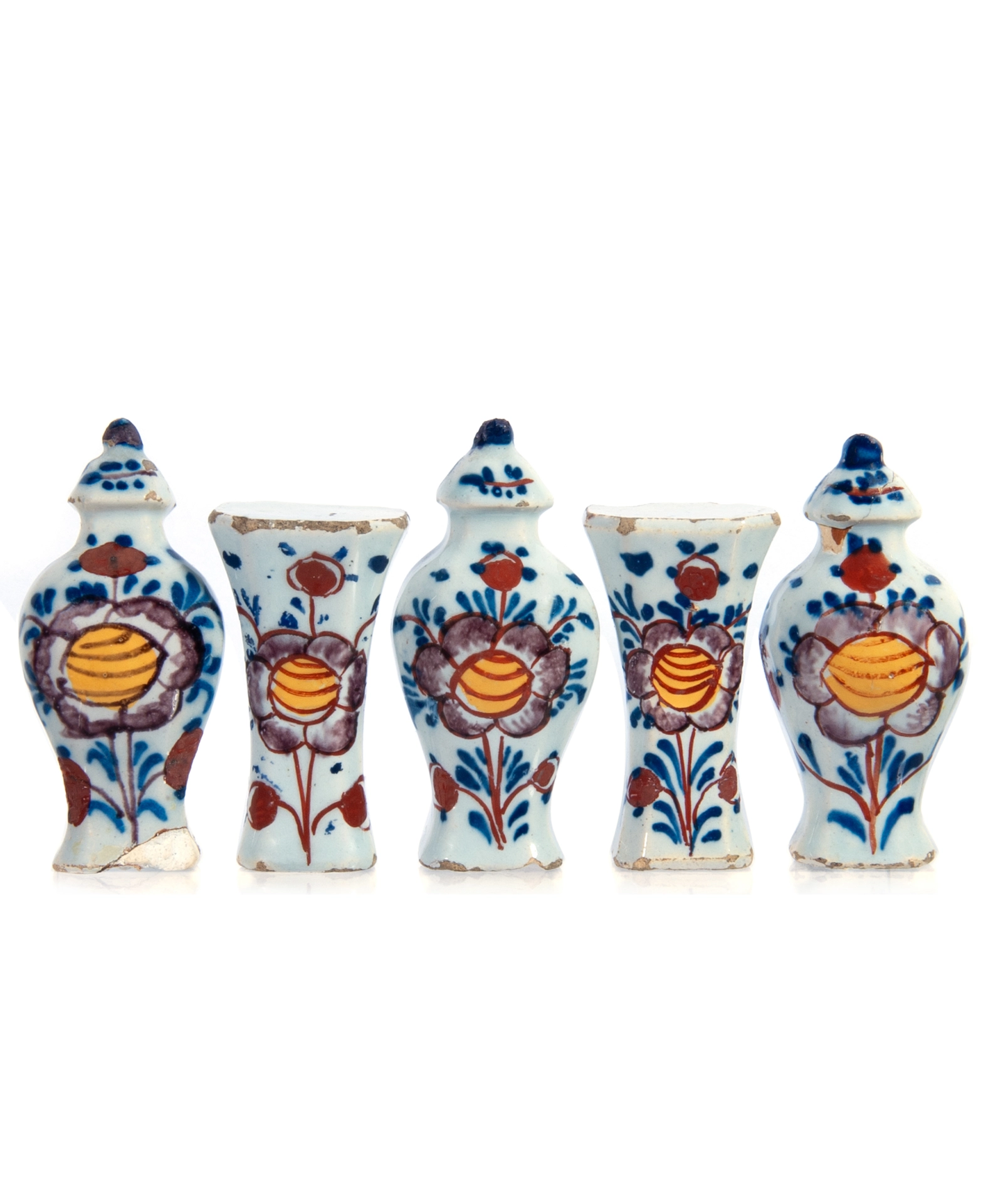 Miniature Garniture of Five Dutch Delft Polychrome Vases for in a Doll's House