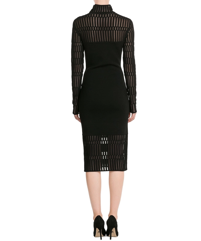 Mugler's fitted knit dress is detailed with sheer inserts - a sultry contrast to the block black color and the modest high neckline