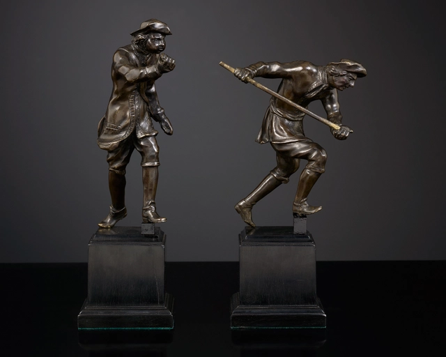 A couple of bronze figurines representing participants in the "long hunt." One hunter is stabbing with a spear, the other is presumably a horn blower.