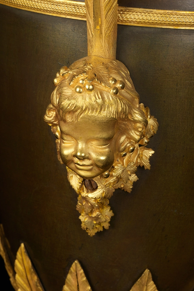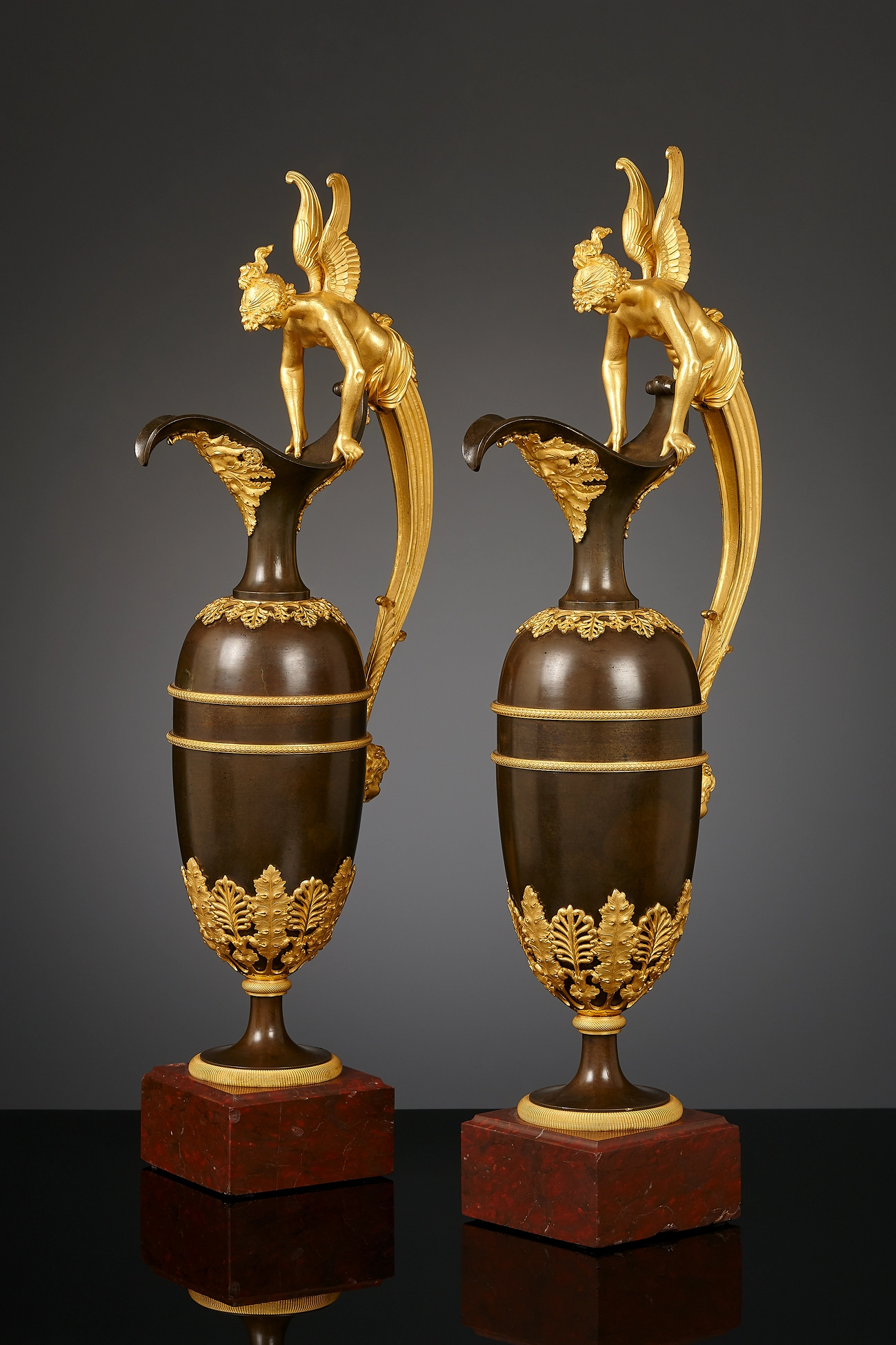These outstanding and large ewers can be attributed to Claude Galle (1759-1815), one of the foremost bronziers and fondeur-ciseleurs of the late Louis XVI and Empire periods, whose oeuvre included a number of near identical ewers. Among them is a pair at Pavlovsk Palace and at Yusupov Palace at St. Petersburg, a pair in the Ostankino Palace, Moscow and another in the Württemberg Landesmuseum, Stuttgart. A further comparable pair, owned during the nineteenth century by the Earls of Essex at Cassiobury Park.