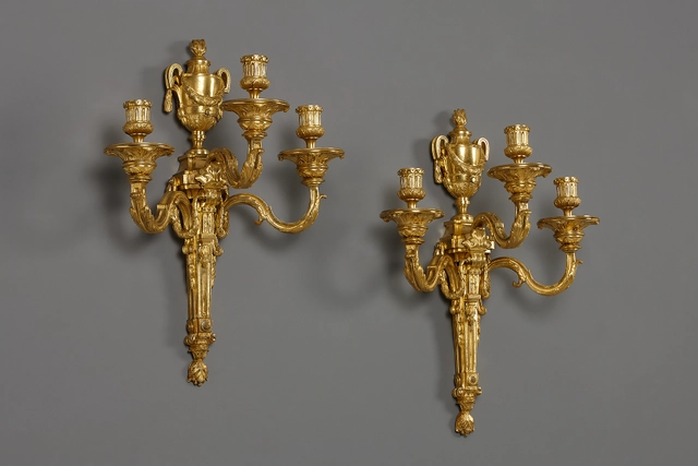 This pair of finely chased gilt bronze wall lights is inspired by the new neoclassical style, which favoured motifs derived from classical antiquity. The backplates are shaped as columns and both wall lights are adorned with laurel swags. The bottom of the torch is decorated with acanthus leaves ending in a hibiscus finial. The torch is crowned by a classical shape urn, decorated with laurel swags and topped with a flame.