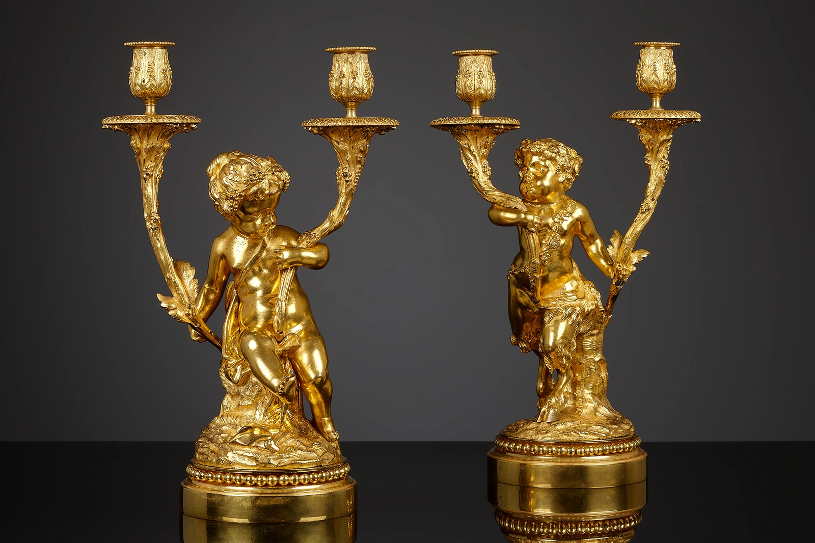 The figures of these candelabra were executed after the celebrated models by Claude Michel dit Clodion (1738-1814) and Louis-Félix de La Rue (1731-1765). The figure of the young satyr was created in 1773, originally modeled with an owl in his right hand, it was called: Le satyre enfant courant avec hibou. Terracotta examples of this model are now in the Cleveland Museum, Philadelphia Museum, Houston and Nancy. Clodion subsequently executed a young female satyr, known as: Satyresse enfant, most probably to go as a pair with the young satyr.