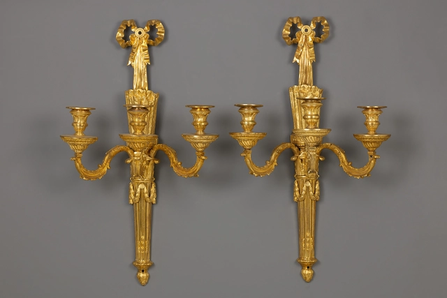 The S-volute shaped arms are decorated with hanging acanthus leaves. The bobèches are decorated with leaf motifs and a stylised edge and hold urn-shaped candleholders. The top of the sconces is styled as the feathers of a bundle of arrows. The lights are hanging from stylised ribbon bows.