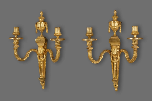 The sconces are made in the style of Jean-Charles Delafosse (1734-1791). His style is characterized by combined and intertwined architectural forms with a multitude of detail and a wealthy formal idiom. The rich imagination with which these objects are designed give them a unique aesthetic appeal.