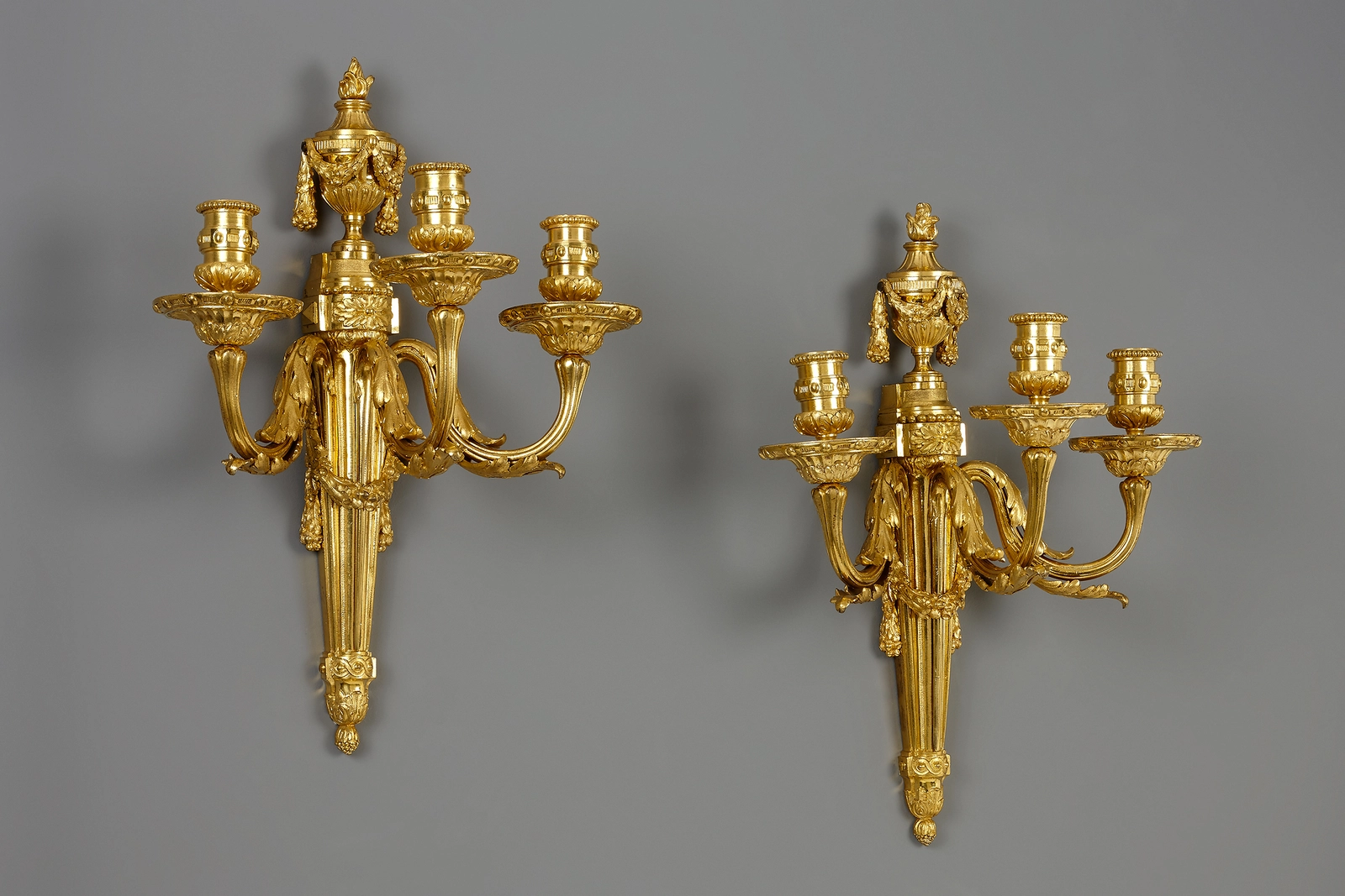 This pair of finely chased gilt bronze wall lights are inspired by the new neoclassical style, which favoured motifs derived from classical antiquity. The backplates are shaped as torches and both wall lights are adorned with laurel swags. The bottom of the torch is decorated with interlace motifs and beads, acanthus leaves ending in a pinecone finial. The torch is crowned by a classical shape urn, decorated with laurel swags and topped with a flame.
