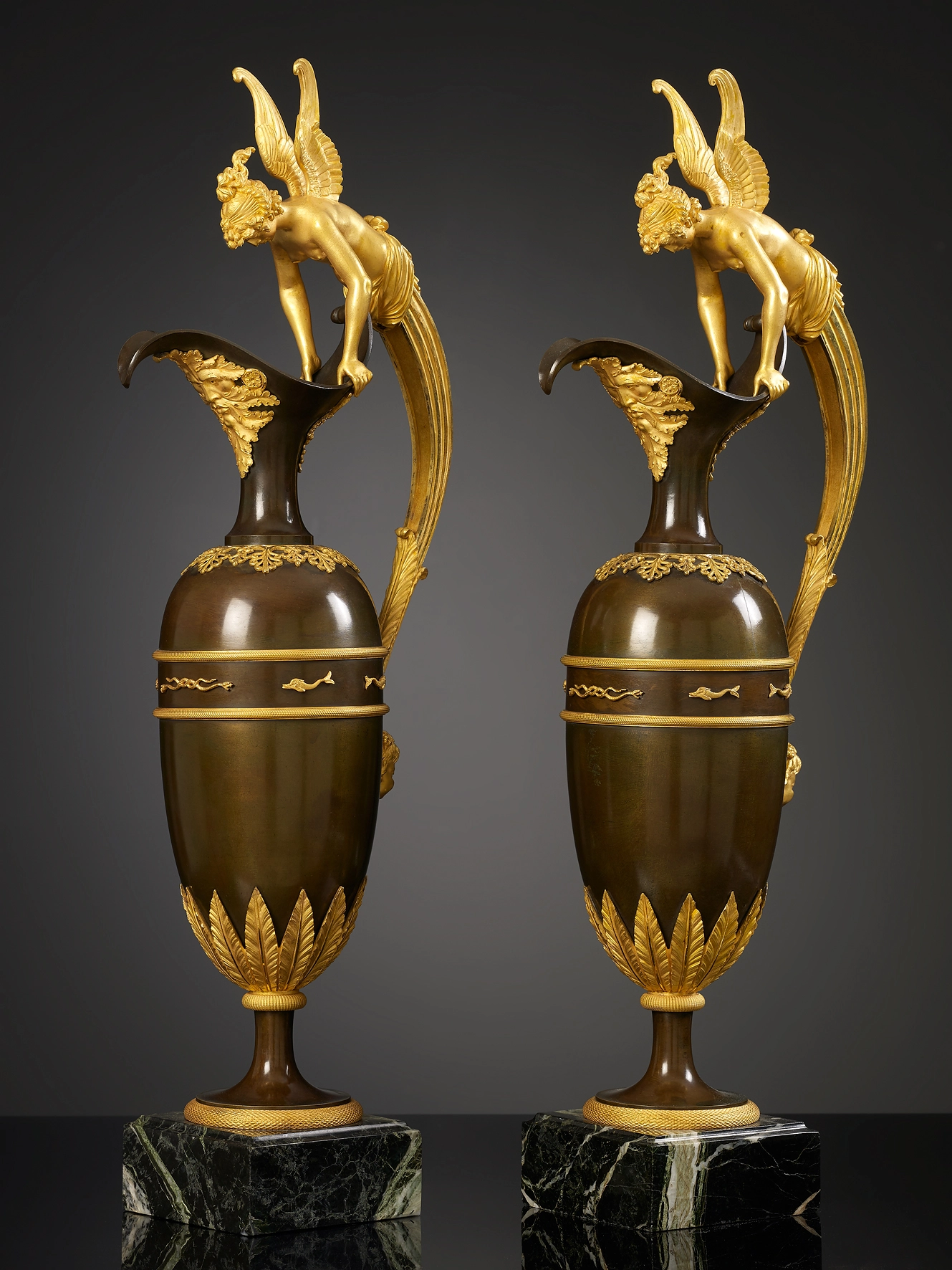 A fine pair of Empire gilt and patinated bronze ewers attributed to Claude Galle of elongated baluster form mounted around the collar and base with stylized palmettes and acanthus leaves and centred around the body by a frieze of snakes and dolphins, the spout applied with a bearded male mask, the channelled and pearled scrolled handle supported on a putto mask and terminated above by a winged classical maiden clasping the rim, the whole on a spreading circular domed foot on a square Vert de Grèce marble base.