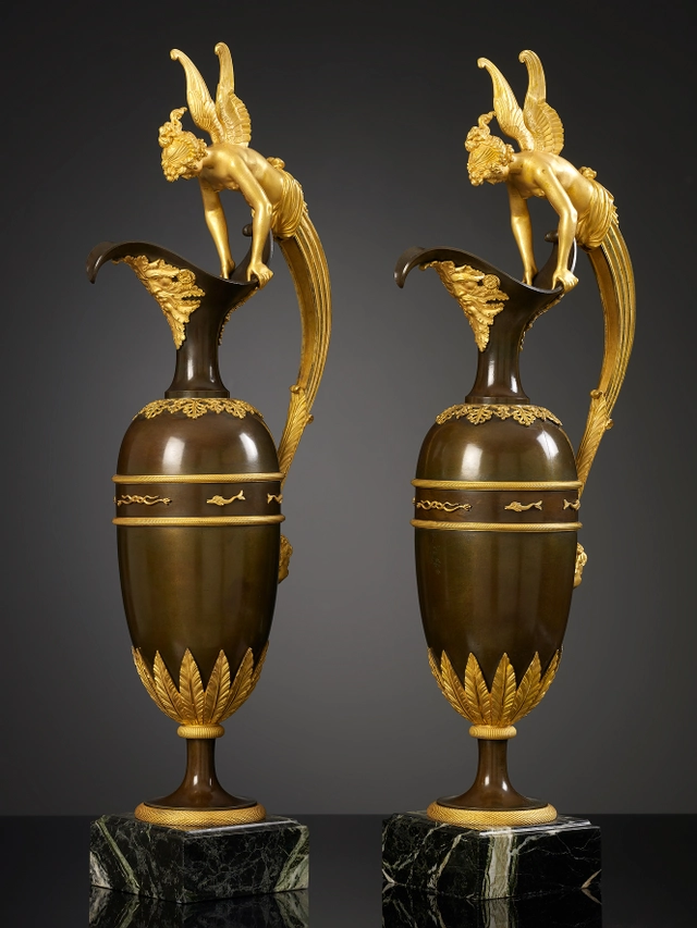 These outstanding and large ewers can be attributed to Claude Galle (1759-1815), one of the foremost bronziers and fondeur-ciseleurs of the late Louis XVI and Empire periods, whose oeuvre included a number of near identical ewers. Among them is a pair at Pavlovsk Palace and at Yusupov Palace at St. Petersburg, a pair in the Ostankino Palace, Moscow and another in the Württemberg Landesmuseum, Stuttgart. A further comparable pair, owned during the nineteenth century by the Earls of Essex at Cassiobury Park.