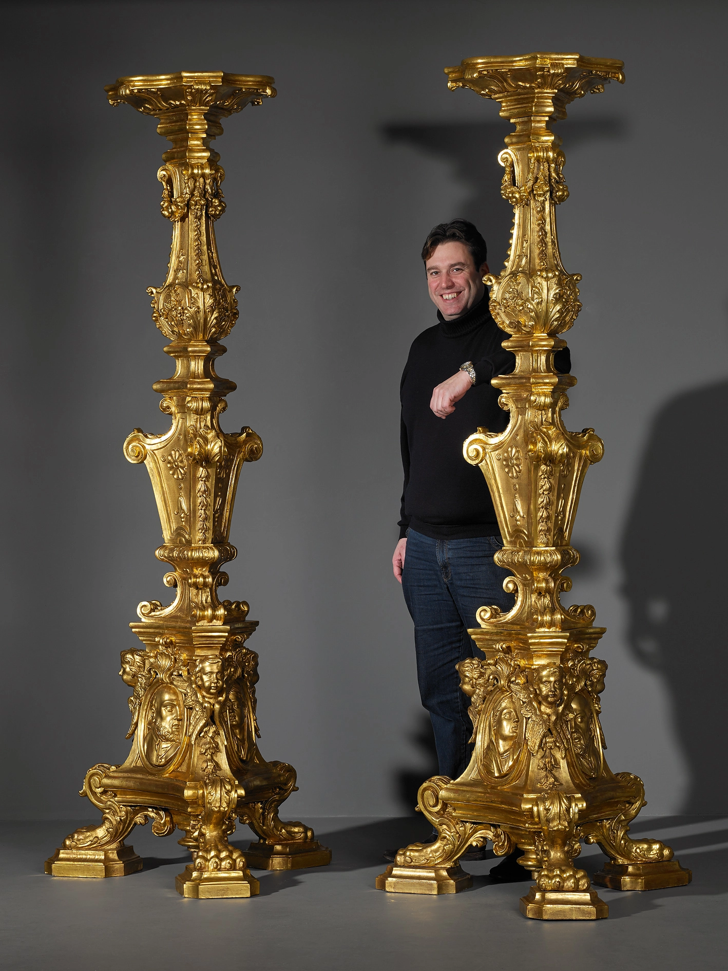 A pair of large wooden sculpted torchères. The torchères rest on three clawed feet. The triangular plinth is decorated with medallions with representations of a man, a woman, and a sacred heart. The edges of the triangular base are decorated with winged putto heads. The trunk consists of a pinnacle on a triangular vase-shaped base. The tapering pinnacle is decorated with flower and leaf motifs and hanging garlands with apples at the top. The torchères are topped with a round scalloped plateau decorated with acanthus.
