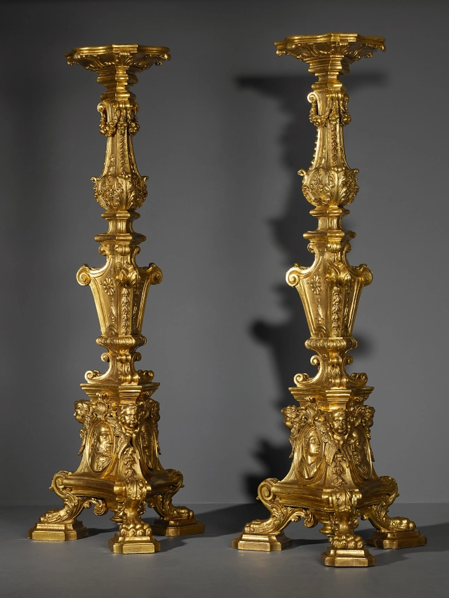 From the beginning of the reign of Louis XIV giltwood ornaments and furniture were introduced into the European interior, gaining importance over time. Torchères were designed to carry lighting ornaments like large candelabra. In most cases they were placed in the corners of a room or between to windows.